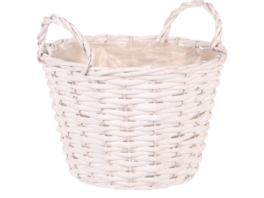 Kulatý proutěný obal na květiny v elegantní bílé barvě s praktickou igelitovou vložkou. Ideální pro stylové aranžování květin, který dodá každému prostoru nádech přírodní krásy a čistoty.