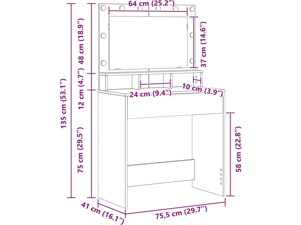 - Materiály: Tento toaletní stolek je vyroben z kompozitního dřeva. Je robustní a spolehlivý. Kompozitní dřevo je odolné a vypadá pěkně, takže si udrží svůj vzhled i po letech. Je odolný vůči deformacím a poškození, takže vám vydrží dlouho.