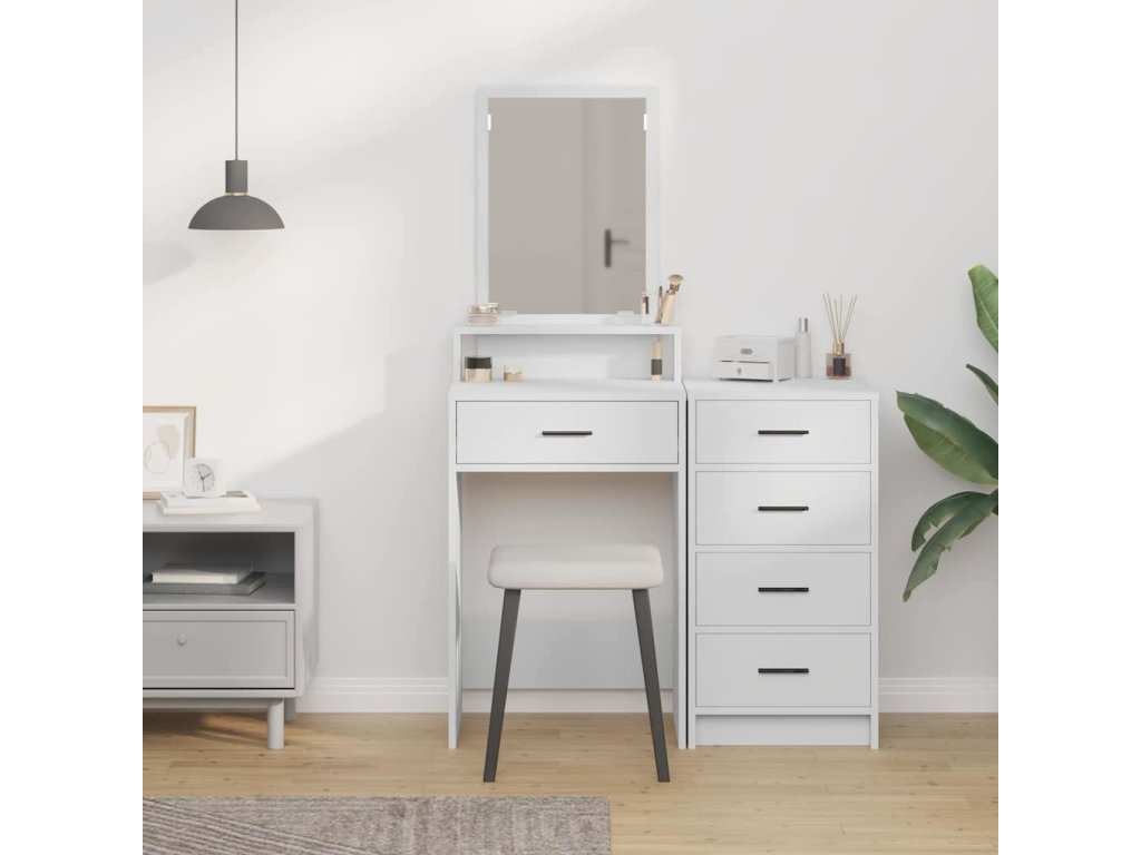 Tento moderní toaletní stůl je opravdu elegantním a funkčním doplňkem do každé ložnice. Se svým elegantním obdélníkovým tvarem nabízí současný styl, jednoduchost a funkčnost. Toaletní stůl spojuje praktické použití s estetickou krásou, ideální pro každodenní úpravy. Stabilní povrchy z kompozitního dřeva s matným povrchem vytvářejí příjemnou atmosféru a zrcadlo s různými zásuvkami splní vaše úložné potřeby a udrží vše organizované.