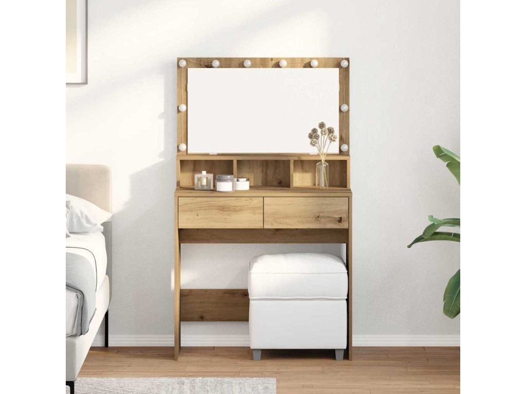 Tento moderní toaletní stolek je úžasným středobodem každé ložnice díky svému elegantnímu designu a spoustě úložného místa. Jeho štíhlý obdélníkový tvar ztělesňuje moderní vzhled, který kombinuje funkčnost a styl pro tvou toaletní část. Integrovaná LED světla ve zrcadle zajišťují skvělou viditelnost, takže je to praktická volba pro denní péči a úpravy.