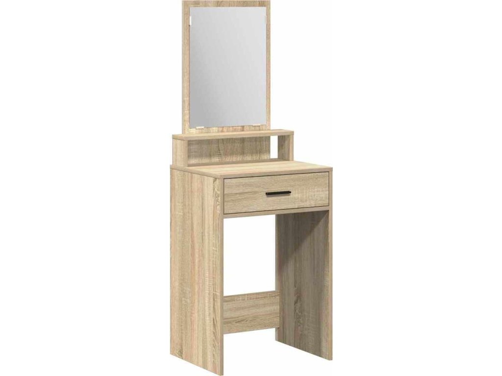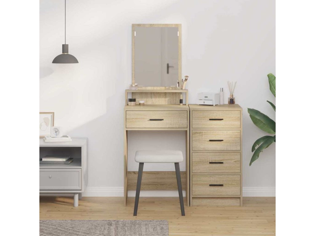 Tento moderní toaletní stůl je opravdu elegantním a funkčním doplňkem do každé ložnice. Se svým elegantním obdélníkovým tvarem nabízí současný styl, jednoduchost a funkčnost. Toaletní stůl spojuje praktické použití s estetickou krásou, ideální pro každodenní úpravy. Stabilní povrchy z kompozitního dřeva s matným povrchem vytvářejí příjemnou atmosféru a zrcadlo s různými zásuvkami splní vaše úložné potřeby a udrží vše organizované.