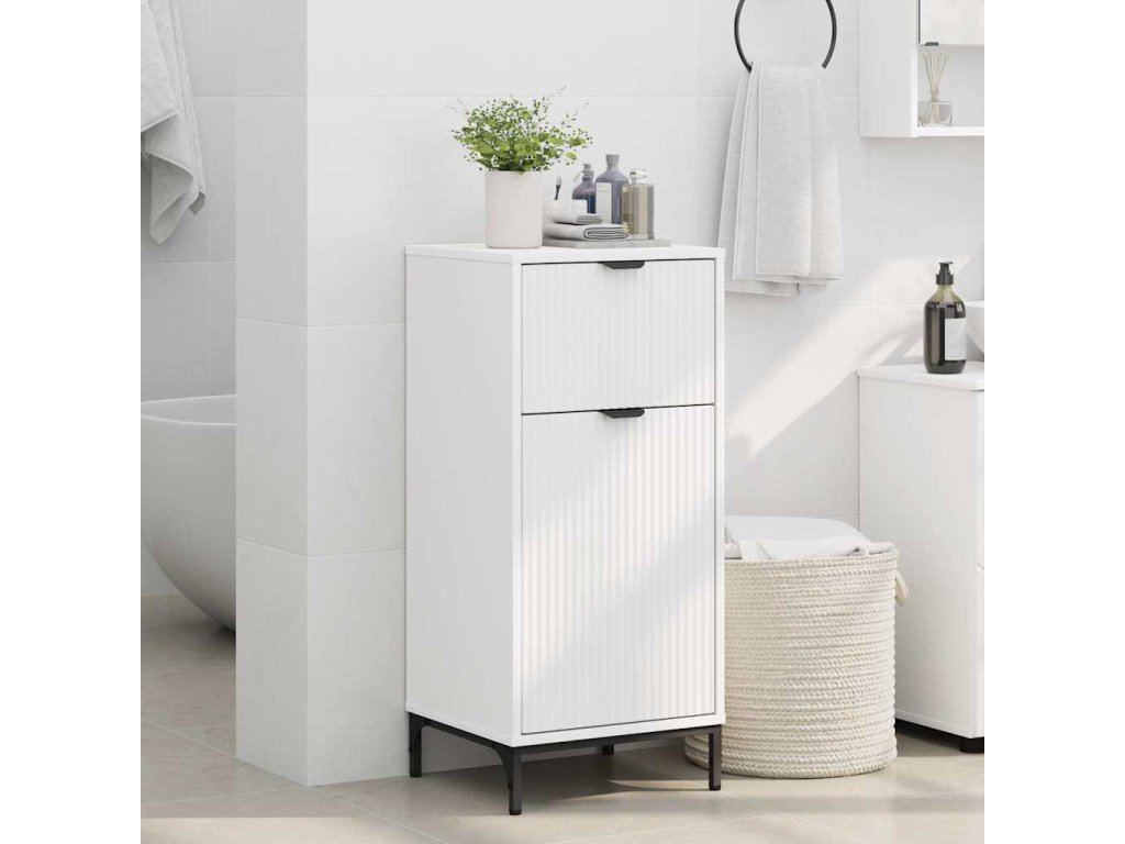 - Inženýrské dřevo a kovová konstrukce Naše skříňka je vyrobená z odolného inženýrského dřeva, které spojuje sílu s atraktivním vzhledem. Kovové nohy dodávají stabilitu, takže skříňka zůstává pevná i pod maximálním zatížením. Kombinace těchto materiálů vytváří výrobek odolný na každodenní použití, což je skvělá volba pro jakoukoli moderní koupelnu.
