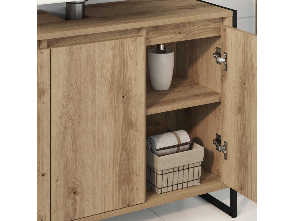 - Ocelové nohy: Skříňka stojí na ocelových nohách, které jí dodají stabilitu a spolehlivost. Nejen, že tím získáváte robustní základ, ale také se na designu projevuje industriální styl. Tyhle nohy zaručují, že bude skříňka dlouho sloužit a navíc vypadá skvěle.