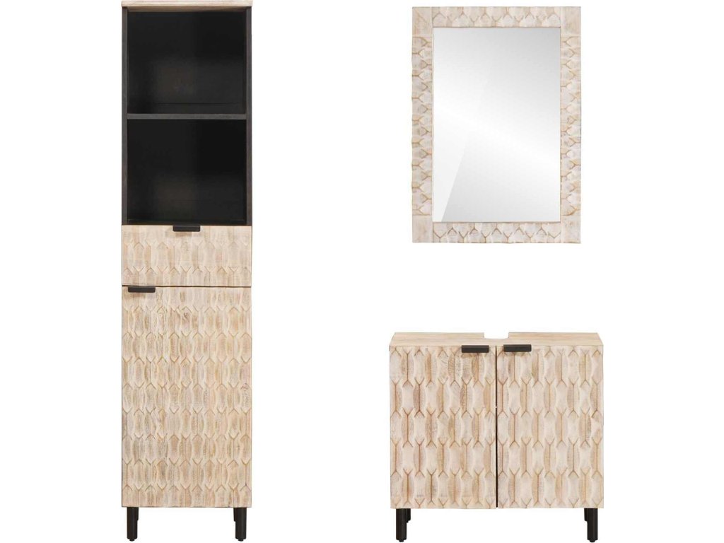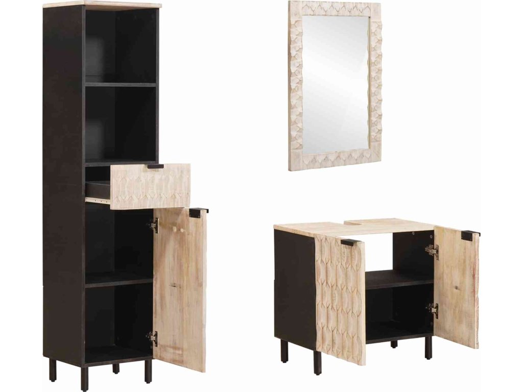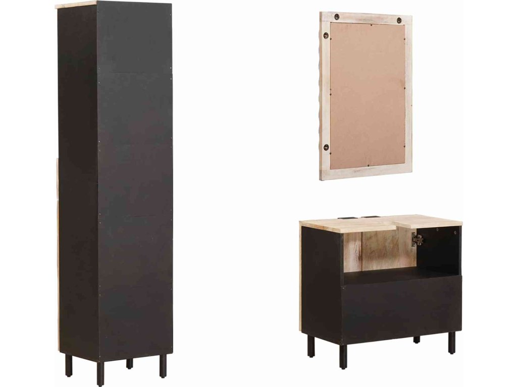 - Masivní mangové dřevo: Koupelnová souprava je vyrobena z masivního mangového dřeva, které je známé svou odolností a přirozenou strukturou dřeva. Tento materiál zajišťuje dlouhou životnost a do koupelny přidává teplou, bohatou texturu.