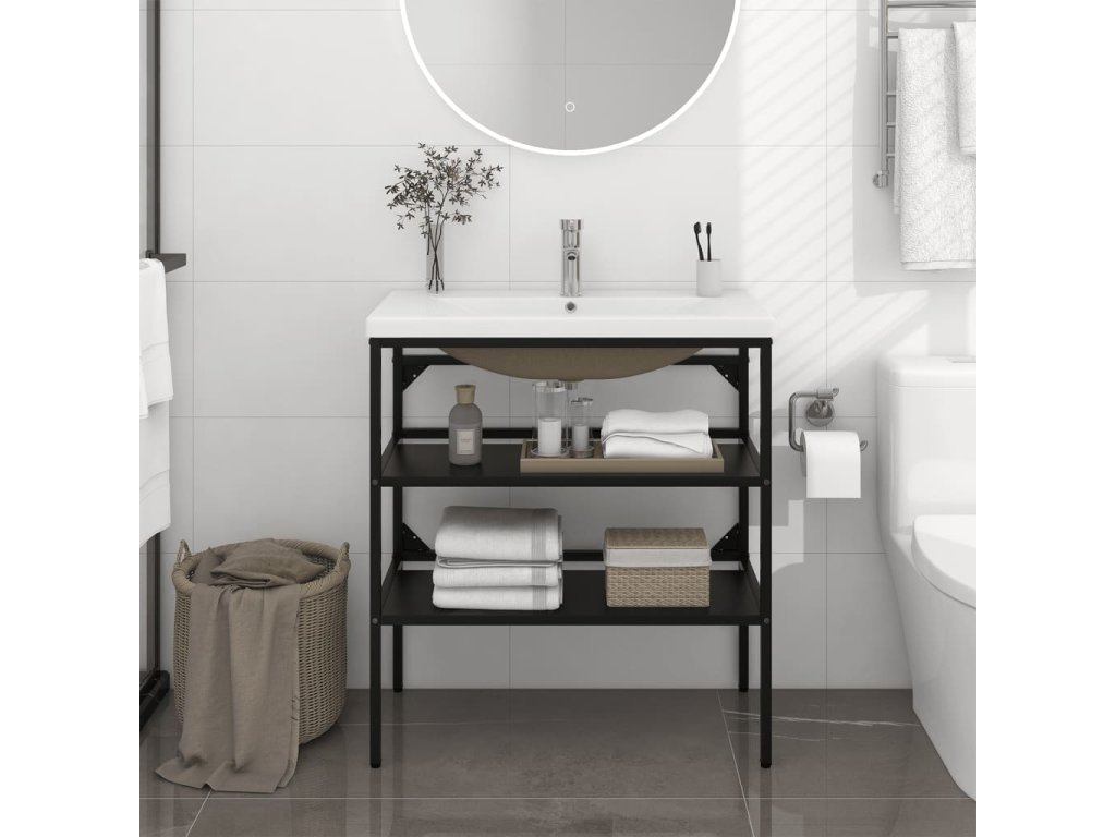 Stojan je vyroben z práškově lakovaného železa, takže je stabilní a odolný. Tento umyvadlový rám umožňuje snadný přístup k ručníkům a košíčkům a nabízí větší úložný prostor než uzavřené skříňky. Keramické umyvadlo je kromě praktického využití také ozdobou vašeho obytného prostoru. Se svým moderním designem se toto umyvadlo hodí do každého interiéru. Je vybavené přepadem pro odtékání vody a jeho glazovaný povrch přináší moderní a elegantní design. Rám i umyvadlo se navíc snadno čistí vlhkým hadříkem.
