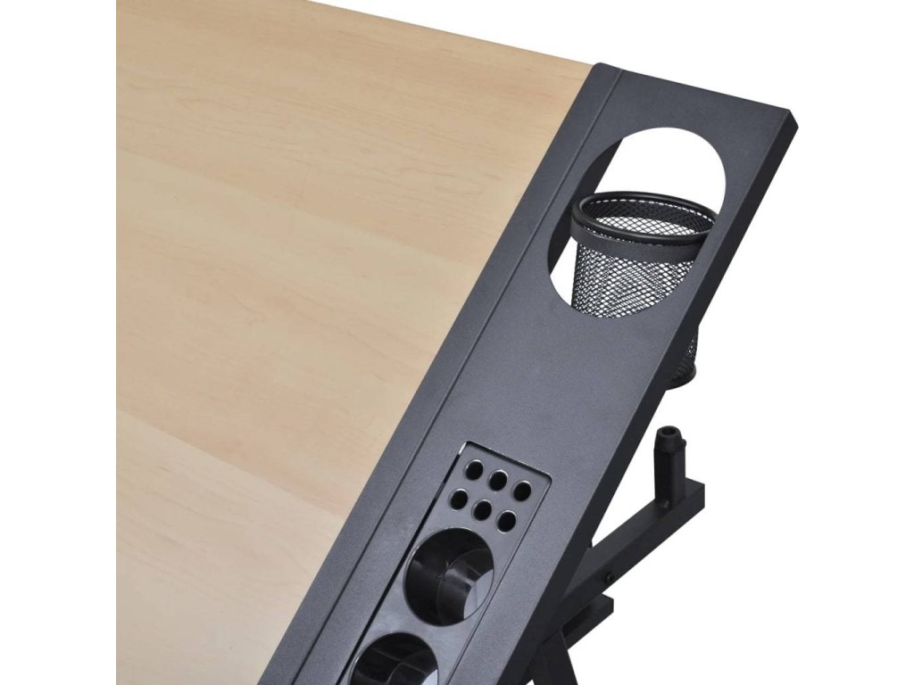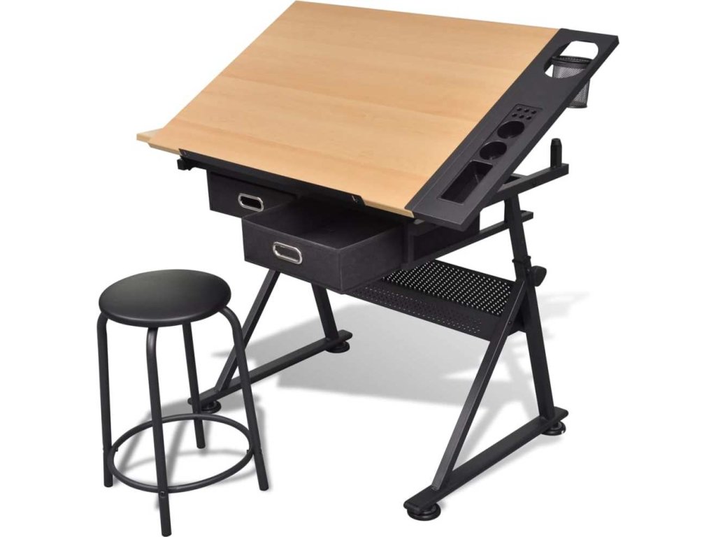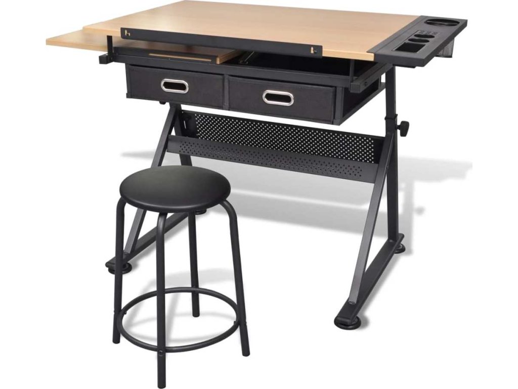 Vysoce kvalitní stůl s naklápěcí stolní deskou vám poskytne spoustu pracovního prostoru. Dvojitou pracovní plochu ocení zejména kreslíři, kteří mohou využít prostor jak na notebook, tak současně i na kreslení. Výšku stolu si můžete nastavit dle vlastních potřeb, takže můžete pracovat v potřebné pozici. Lišta v dolní části zabraňuje sesouvání papíru ze stolu. Po straně pak najdete odkládací přihrádku na kancelářské potřeby. Tužky a další objekty můžete skladovat i ve dvou prostorných zásuvkách. Součástí balení je také polstrovaná stolička, na které se vám bude při práci pohodlně sedět.