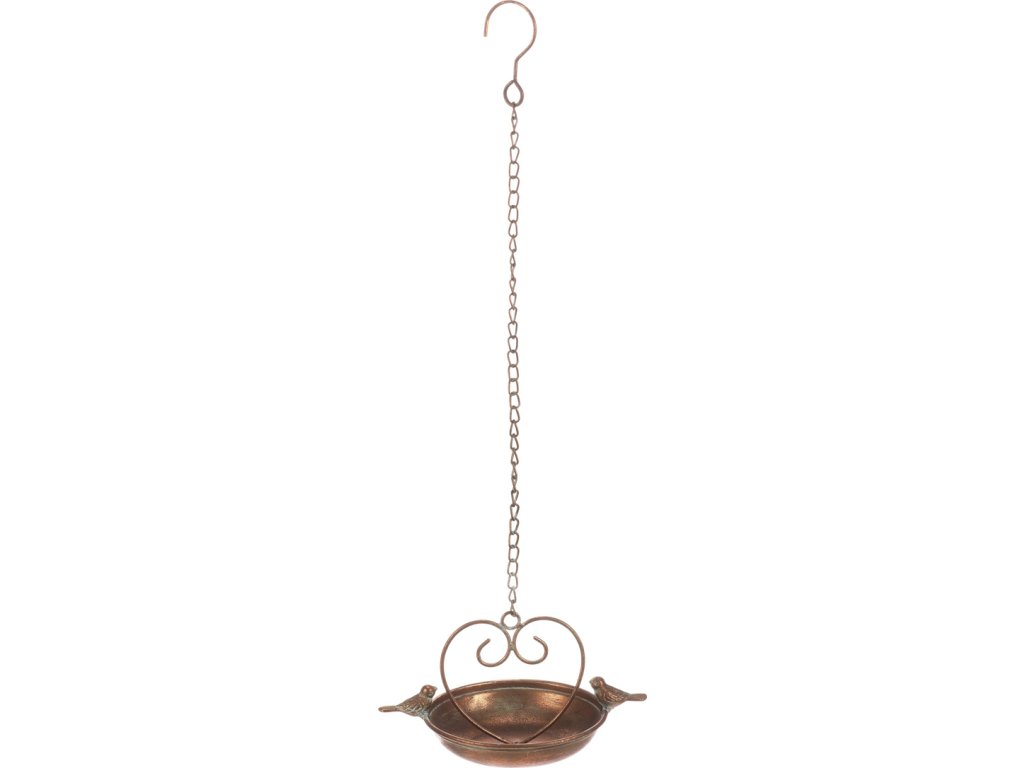 Kovové pítko v měděné barvě je krásnou závěsnou dekorací na řetízku, která oživí vaši zahradu a poskytne ptáčkům ideální místo k napití či osvěžení. Miska je zdobena siluetami dvou pěvců, kteří dodávají celé dekoraci elegantní a přírodní vzhled.