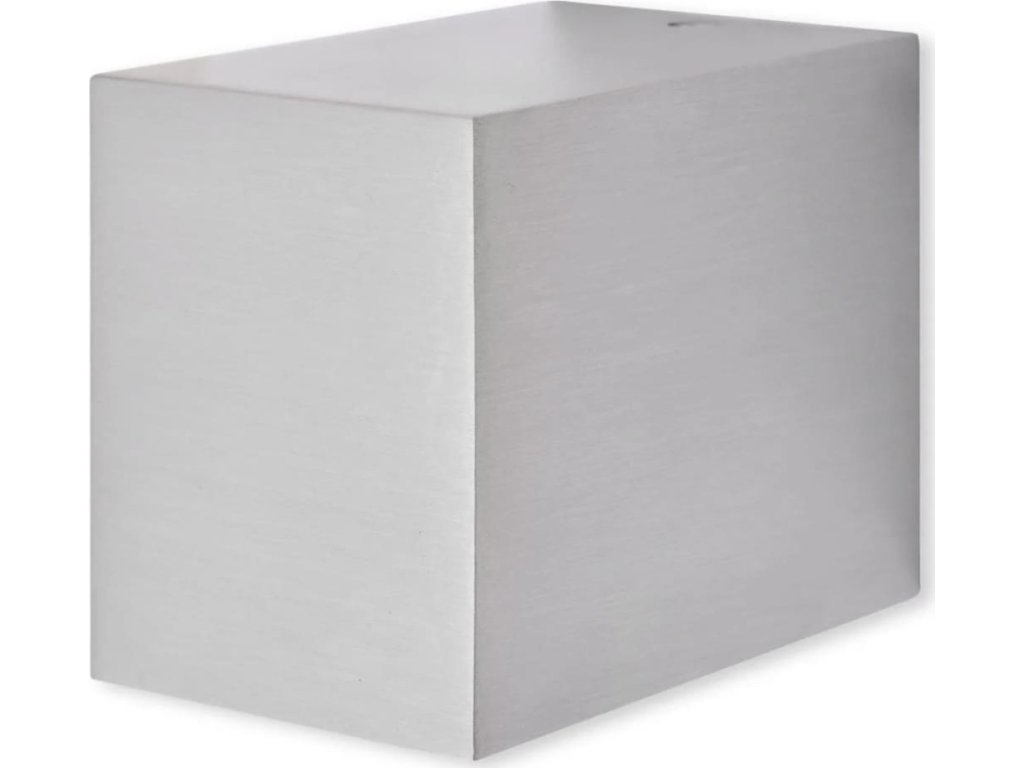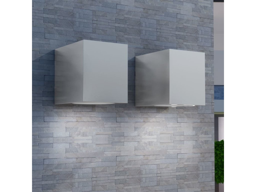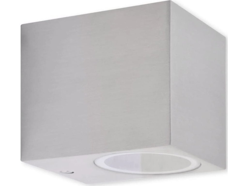 Tato sada sestává ze 2 stylových nástěnných svítidel ve tvaru krychle má minimalistický moderní design. Tato elegantní svítidla, vyrobené z hliníku se vzhledem nerezové oceli, zkrášlí každý venkovní prostor. Vestavěný skleněný difuzér zvyšuje celkový dojem.