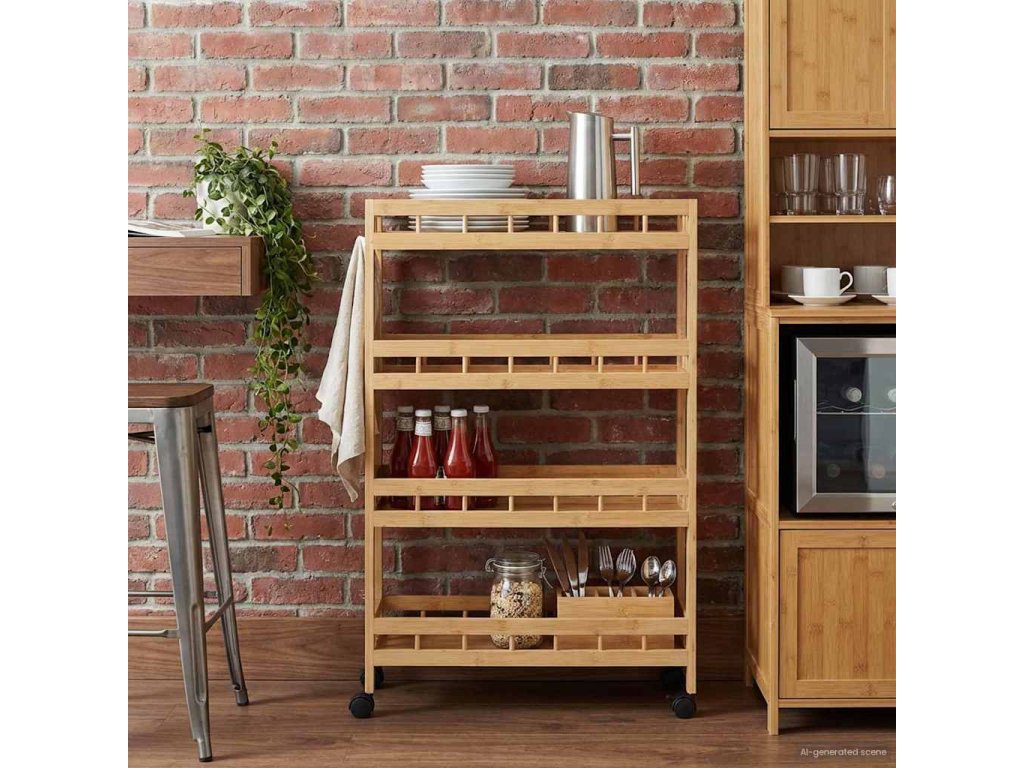 Přidejte do kuchyně funkční eleganci s tímto moderním vozíkem na kolečkách vyrobeným z bambusu. S jeho obdélníkovým designem skvěle zapadne do všech stylů kuchyní a jídelních prostorů. O rozměrech 60 x 18 x 97 cm je to ideální volba pro úložný prostor a styl, snadno se umístí, kam potřebujete.