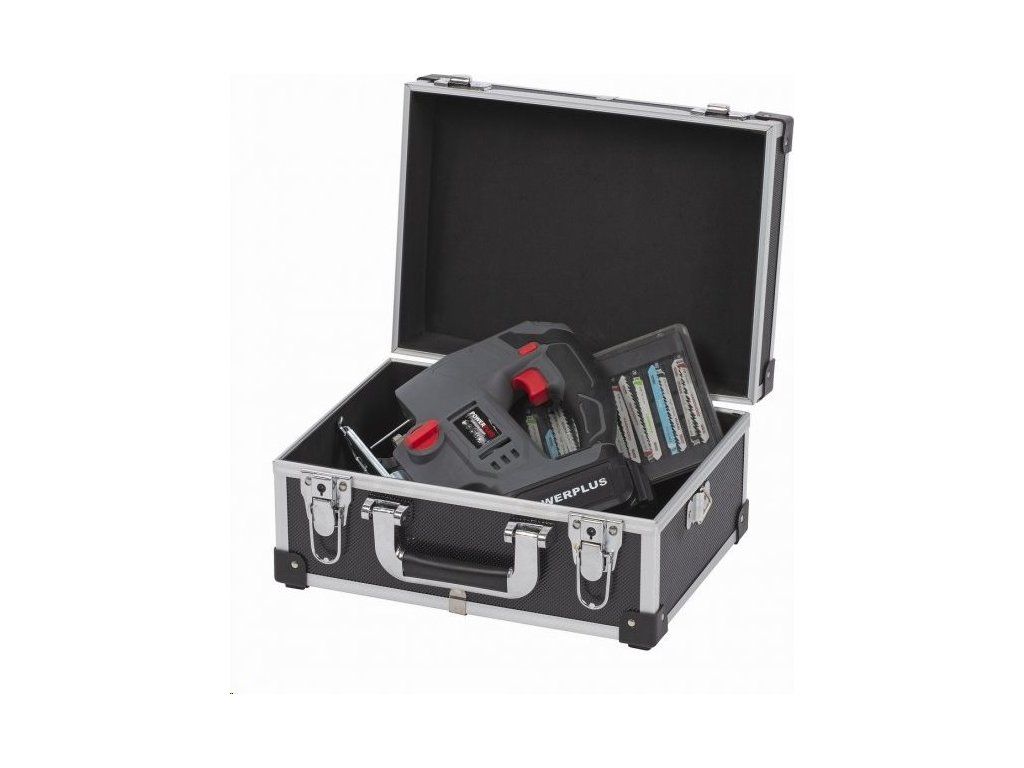 Kufřík v černo-stříbrné kombinaci barev chrání vyztužení v rozích. Samovolnému otevření brání pevné kovové klipsy a uzamykání na klíč (v balení dva kusy). Přenášení usnadňuje integrované madlo a nastavitelný popruh.