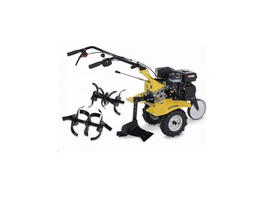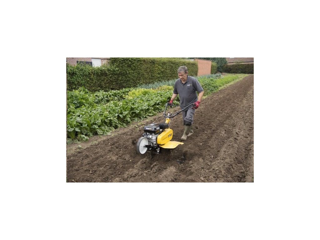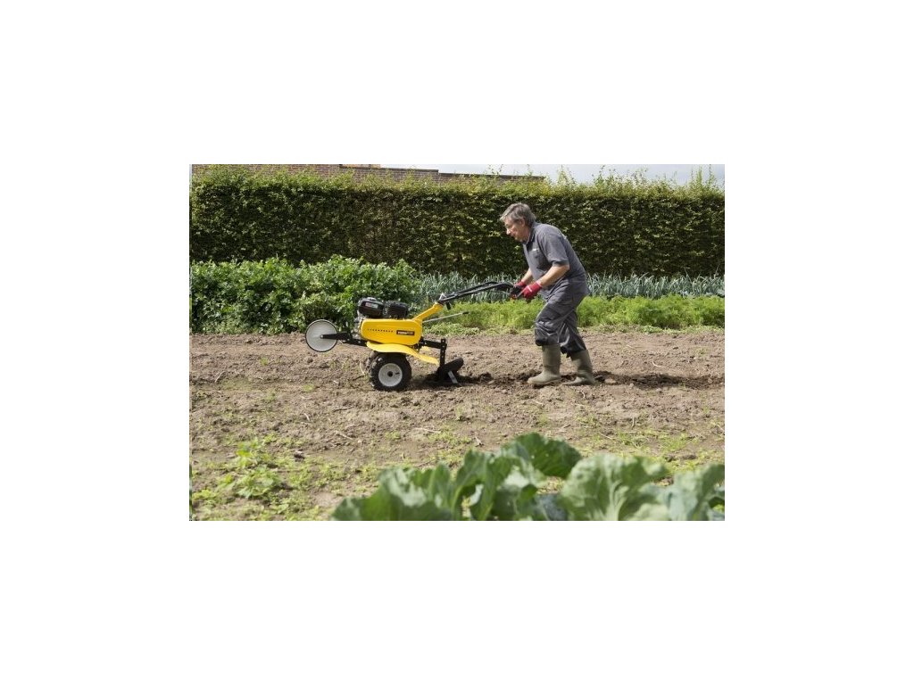 Výměna pluhu za kultivovací nože je velmi snadná a rychlá. Pro nastavení hloubky kultivace slouží zadní kovová opěra. Nastavitelná poloha řídítek, velká nafukovací kola a přední vodící kolečko ještě více usnadní manipulaci s přístrojem. Pro pojezd jsou k dispozici 2 rychlosti dopředu a také jednorychlostní zpětný chod.