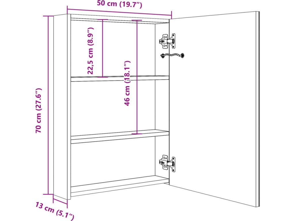 Je vyrobená z kvalitní MDF desky s melaminovou povrchovou úpravou, která zaručuje dlouholetou životnost. Energeticky úsporný LED pásek vám poskytne optimální osvětlení pro líčení, holení či péči o pokožku. Dokonale rozzáří celou místnost, vaši tvář i váš úsměv. Uvnitř skříňky najdete 3 poličky s dodatečným úložným prostorem pro všechny vaše toaletní a kosmetické doplňky. Světlo můžete snadno zapnout či vypnout tlačítkem ve spodní části.