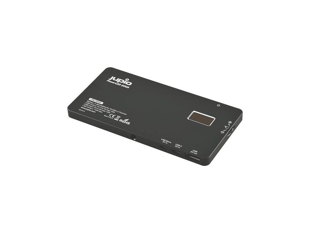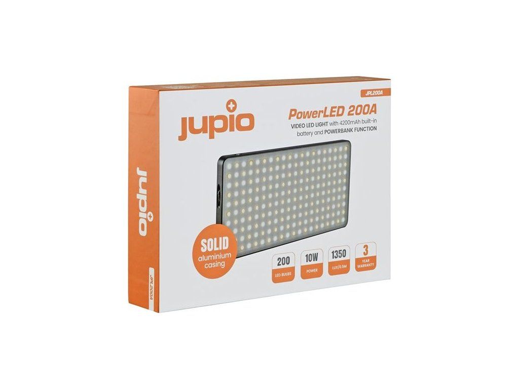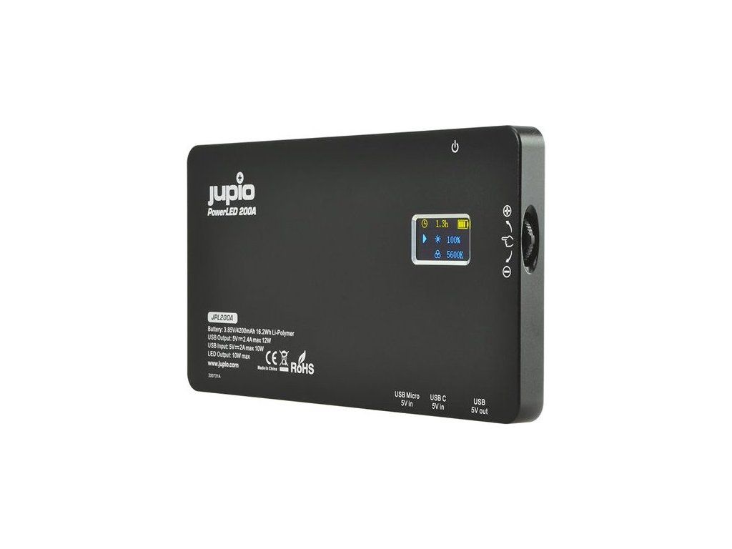 Přenosné světlo Jupio JPL200A kombinuje funkci světla a powerbanky. Světlo je vybaveno 100 LED diodami v 3200 K (teplé světlo) a 100 LED diodami v 5600 K (denní světlo) a má možnost upravit teplotu barev v celém tomto rozsahu.