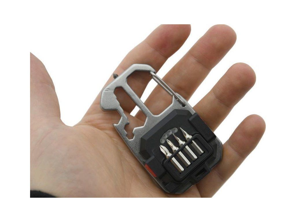 Svítilna má multifunkční využití. Ve tmě si s její pomocí posvítíte na cestu. Jelikož je vybavená karabinou, snadno ji uchytíte na opasek nebo třeba na klíče. Ve spodní části se nachází závit pro uchycení na rozkládací stojan. Bity a univerzální klíč vám usnadní montáž. Svítilna je dokonce vybavená i otvírákem a hrotem pro nouzové rozbití skla.