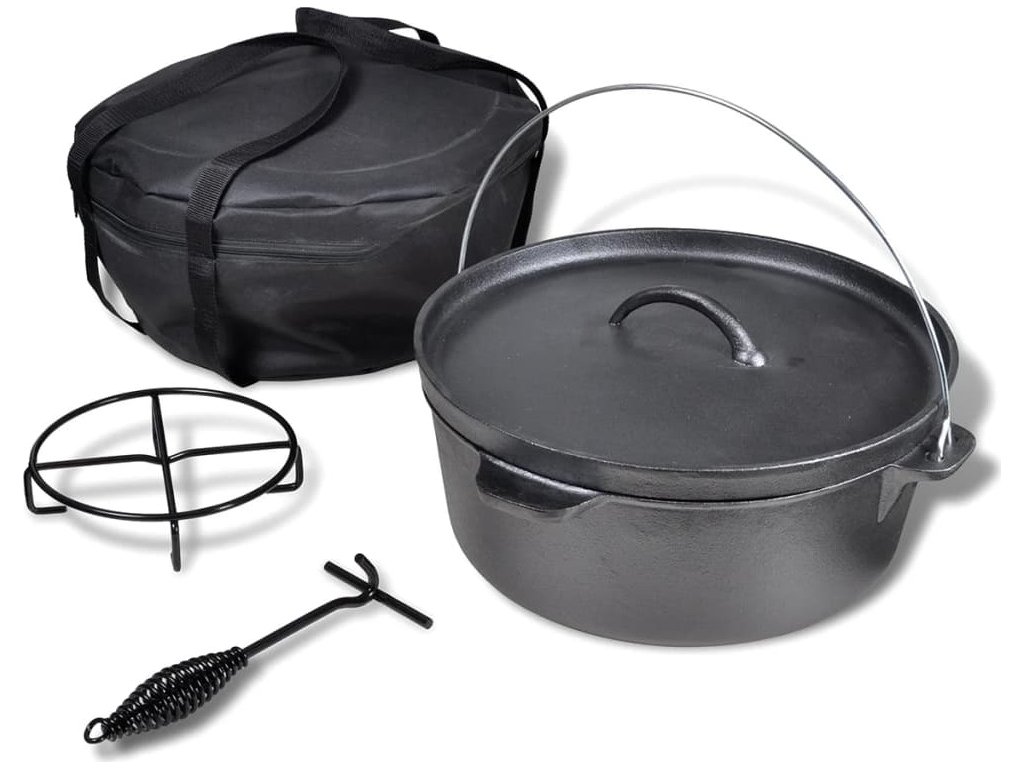 Tento litinový Dutch Oven hrnec s kapacitou 11,3 l je ideální pro začátečníky i experty. Hrnec může být použit pro výrobu husté polévky , omáčky, pečenky , atd. Tento litinový Dutch Oven hrnec je dodáván s černým sáčkem , krytem s zvýšenými okraji , víkem zvedáku a stojanu. Je vyroben z vysoce kvalitních materiálů , takže hrnec je velmi odolný . Součástí balení je černá taška pro přenášení a udržovat hrnec čistý během přepravy. Tato litinový hrnec je univerzální nástroj pro použití doma nebo v přírodě a je ideální pro vaření, pečení a smažení .