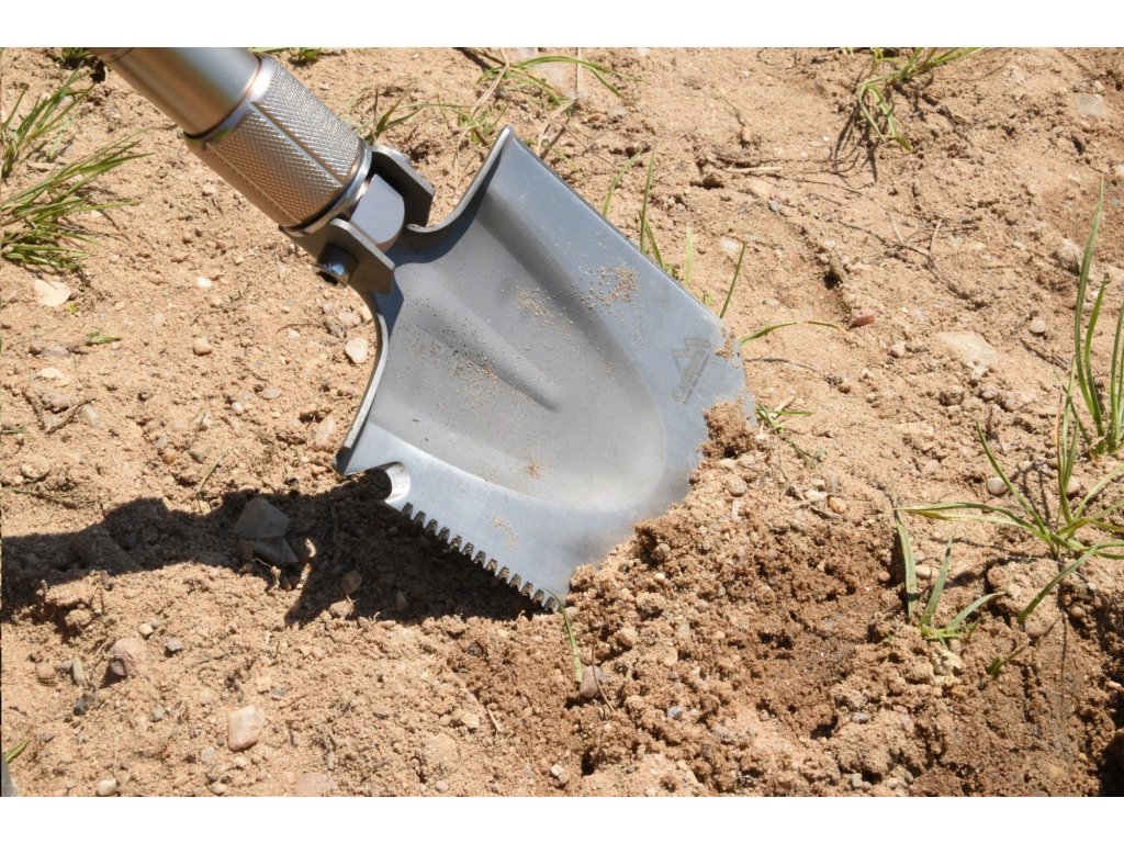 Samotná lopatka je snadno sestavitelná sešroubováním jednotlivých částí. Pouze stačí zvolit vhodný nástroj a jeho předsazení a následně jej jednoduše zajistíte matici na rukojeti. Vše je dodáváno v odolném pouzdře s maskáčovým designem, které si snadno zavěsíte za opasek, takže máte lopatku neustále po ruce.