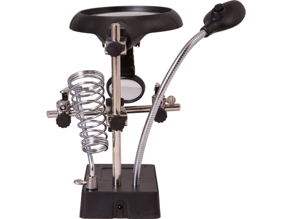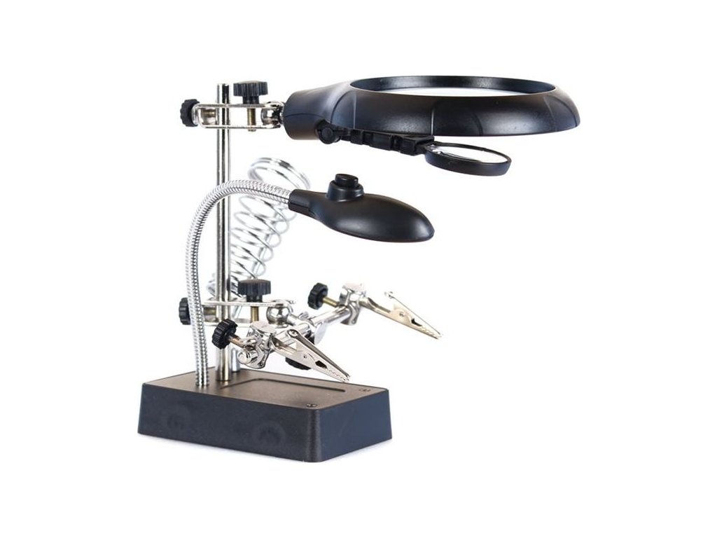 tři lupy, držák nástrojů, ruční svěrky, držák