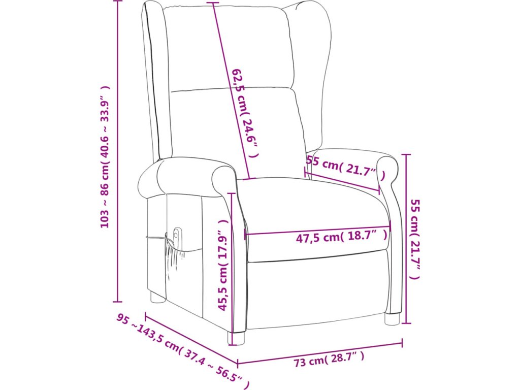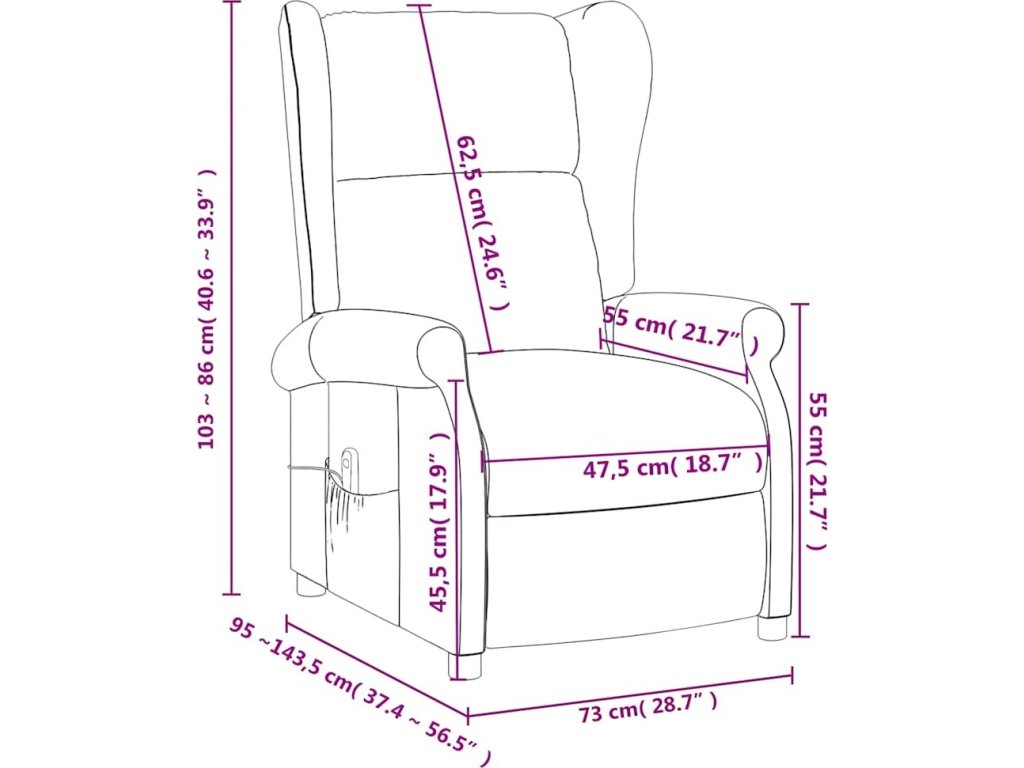 - Rozměry při poloze vsedě: 73 x 95 x 103 cm (Š x H x V)