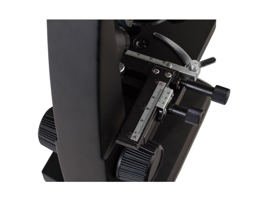 Pracovní stolek mikroskopu s posuvnými měřítky vám umožňuje nastavit pozorovaný preparát, aniž byste se jej museli dotýkat rukama. Tento model je vybaven LED osvětlením. Spodní osvětlení se používá k pozorování transparentních preparátů v procházejícím světle a horní osvětlení ke studiu neprůhledných preparátů v odraženém světle. Pod pracovním stolkem je kotouč se šesti filtry.
