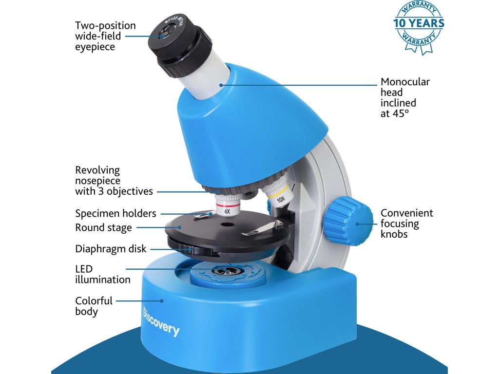 Tento mikroskop základní úrovně využijete nejen na svém dokonalém laboratorním stole, ale s možností spodního osvětlení na baterie a díky velmi malé váze můžete zkoumat preparáty ihned v přírodě.