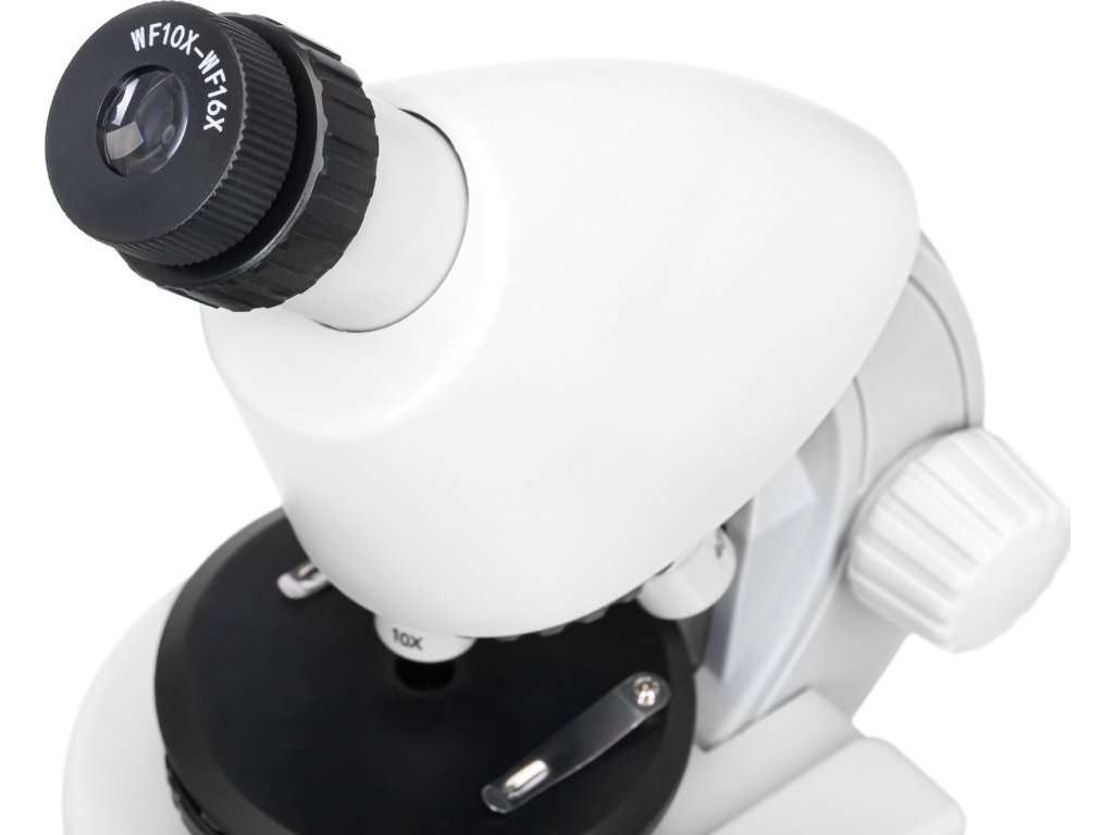 Optický systém se zvětšením od 40x do 640x zvládne přiblížit zvířecí a rostlinné tkáně, buňky, části hmyzu a drobné vodní organismy. Tři objektivy doplňuje posuvný dvoupolohový okulár se zvětšením 10x - 16x.