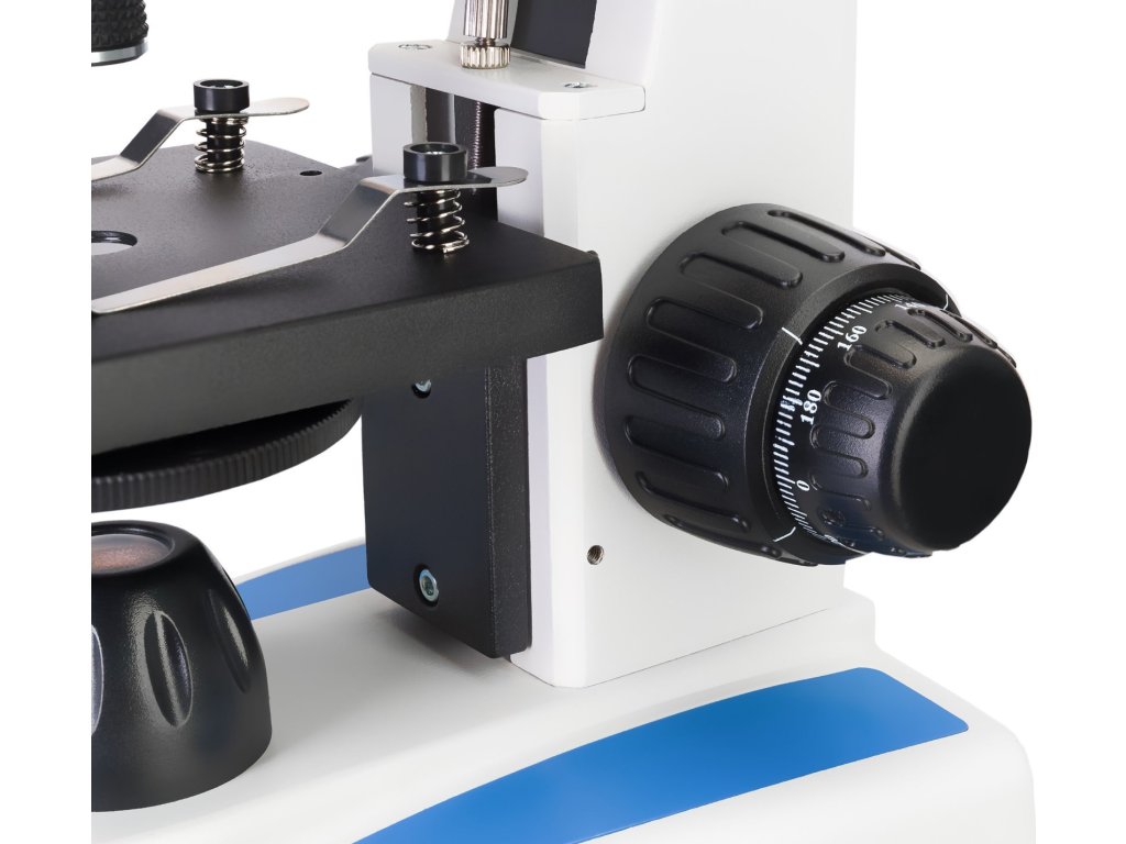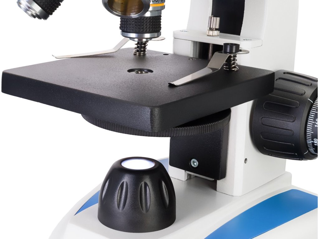 Mikroskop ovládáte pomocí tlačítek na bočním panelu a na zadní straně. Jelikož je vybavený duálním osvětlením, nachází se LED diody na obou stranách stolku. Nastavíte si jas světla podle vašich potřeb tak, abyste vše dobře viděli. Vzorek si upevníte pomocí držáků a kotoučové aperturní clony a pustíte se do zkoumání.