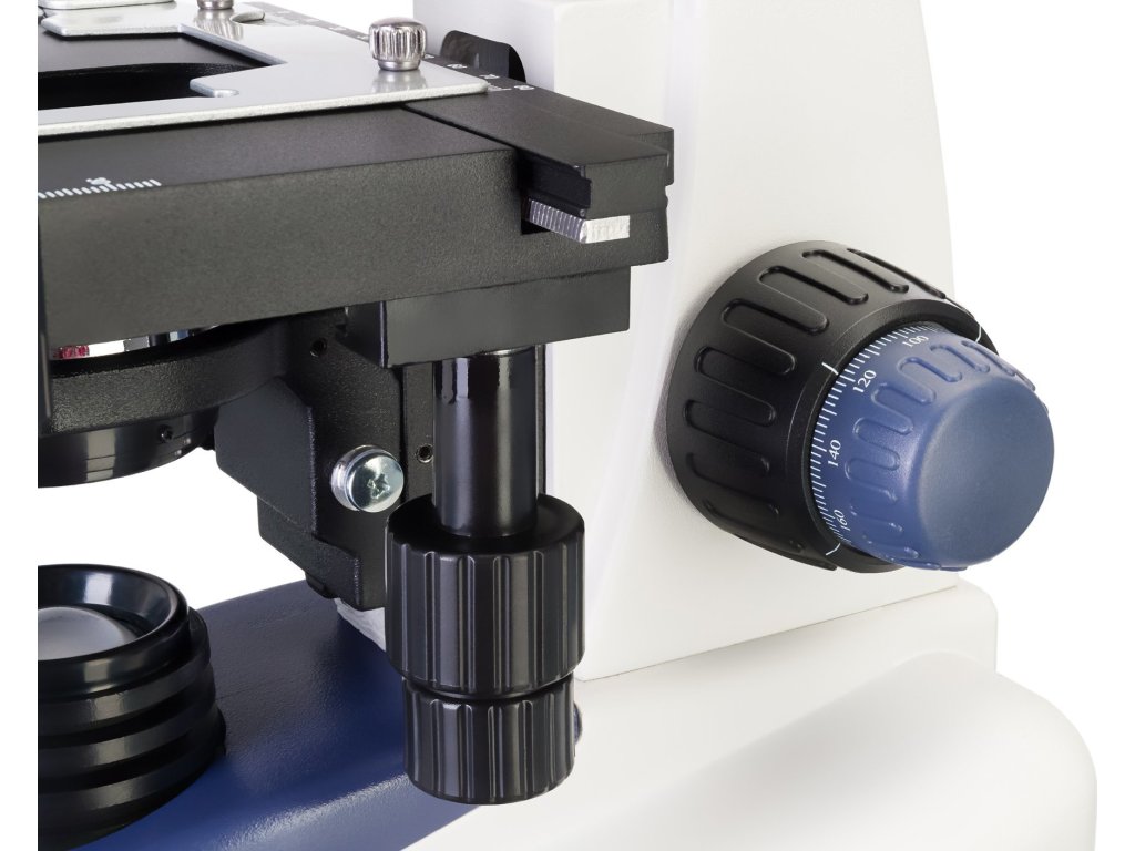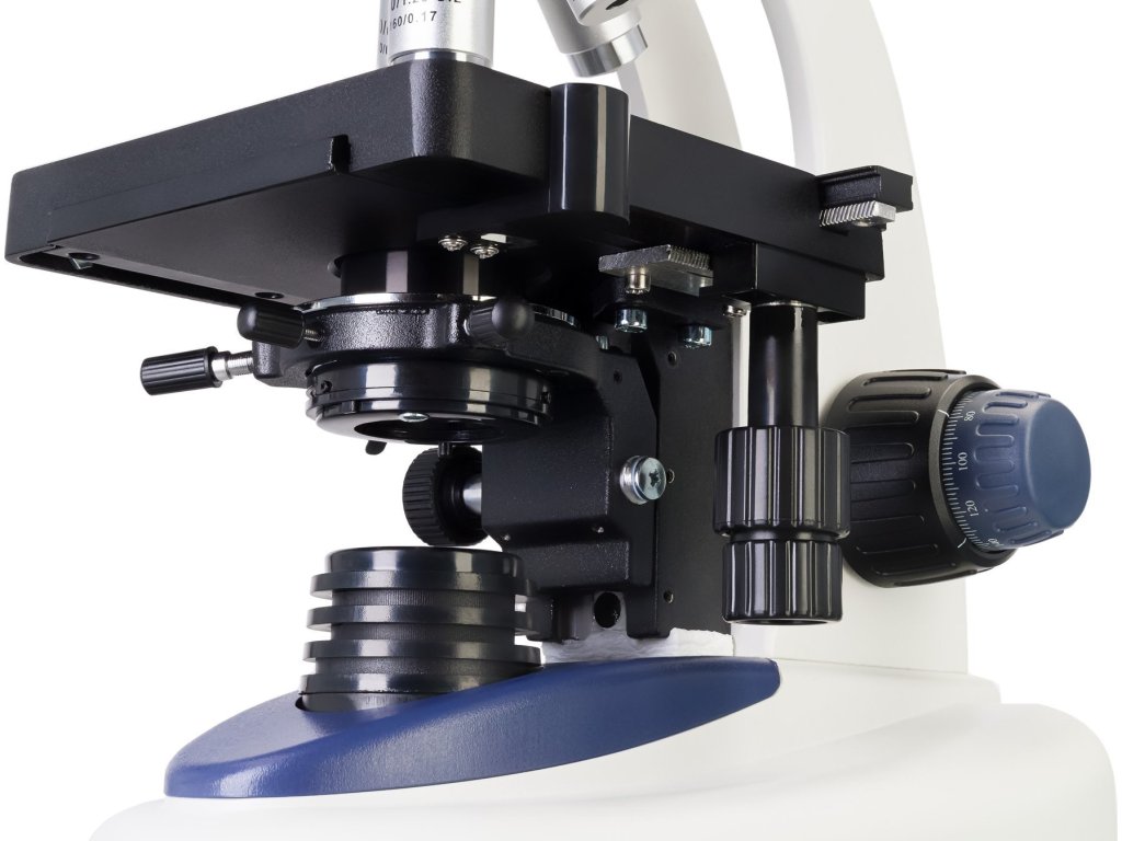 Mikroskop ovládáte pomocí tlačítek na bočním panelu a na zadní straně. Stmívatelná LED dioda vám zajistí kvalitní spodní osvětlení. Na stolku se nachází mechanické měřítko pro zjištění velikosti objektů. Pod stolkem najdete Abbeův kondenzor pro zesílení světelného paprsku, irisovou clonu zmenšující paprsek světla a držák filtru.