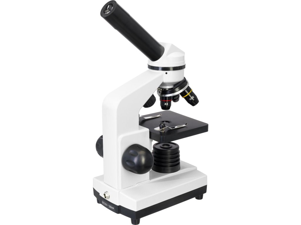 průhledné i neprůhledné preparáty. Plastové tělo tohoto mikroskopu je