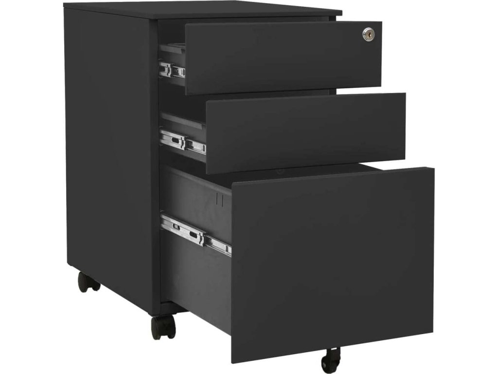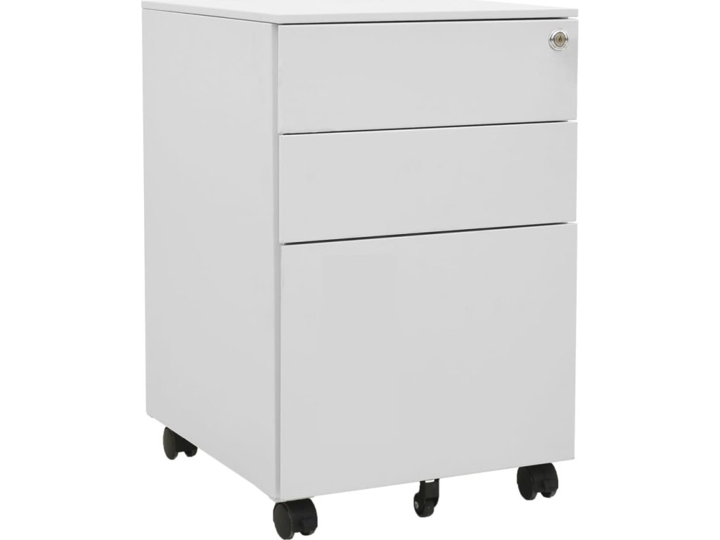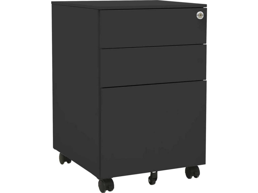 Tato kartotéka je vyrobena z oceli, takže je odolná a snadno se čistí. Disponuje 3 zásuvkami a zámky, takže můžete přehledně třídit soubory do různých kategorií a mít je bezpečně uložené. Každá zásuvka je vybavena 1 odnímatelnou závěsnou tyčí, kterou lze libovolně kombinovat pro uložení souborů formátů letter, legal a závěsné desky velikosti A4. Pojízdná skříňka má zásobník na tužky, se kterým snadno udržíte na stole pořádek. Zásuvky s třídílnými pojezdy s kuličkovými ložisky zajišťují plynulé otevírání a zavírání, i při zvýšené zátěži se zásuvky dají zcela vysunout.