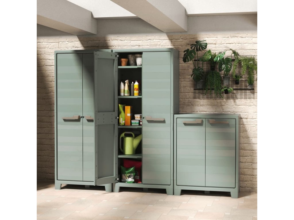 Skříň obsahuje celkem 8 polic s nastavitelnou výškou – každá s nosností až 15 kg. Využijete ji tedy pro skladování dílenského nářadí či zahradnických potřeb. Pokud vyjmete police, uložíte do skříně i náčiní s dlouhou násadou, které by se jinam nevešlo.