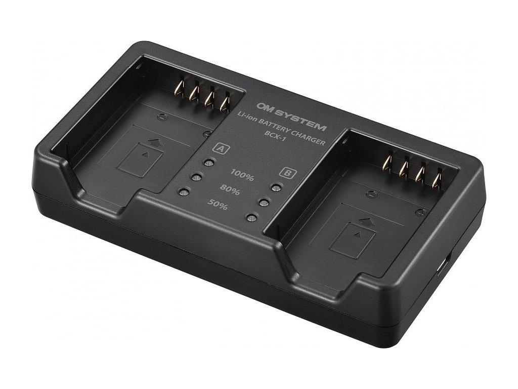 Originální 2slotová nabíjecí stanice BCX-1 zvládne současně nabít až 2 Li-Ion baterie OM System BLX-1 již za pouhých 150 minut. Je vybavena moderním USB-C rozhraním, s jehož pomocí můžete k napájení využívat adaptér F-7AC, dodávaný společně s kompaktním fotoaparátem OM-1, nebo jakýkoliv jiný síťový zdroj s tímto rozhraním na trhu.