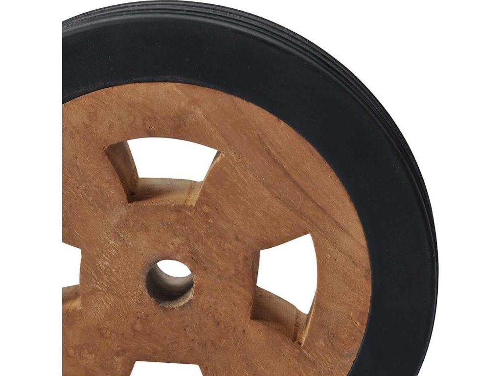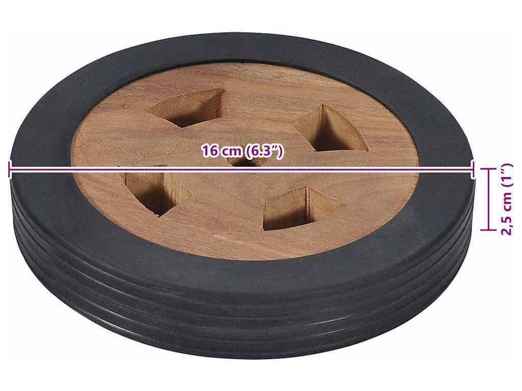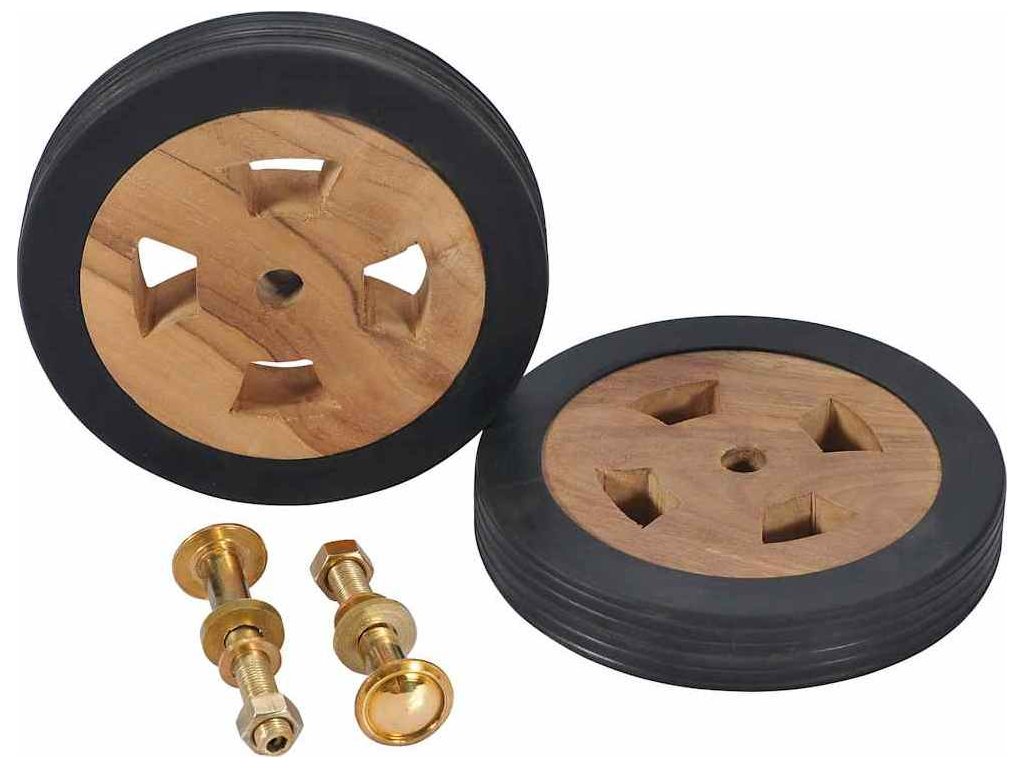 Tento set 2 dřevěných náhradních koleček pro zahradní lehátko s ráfky v závodním stylu. Každé kompletní kolečko, včetně gumového okraje, má průměr 16 cm.