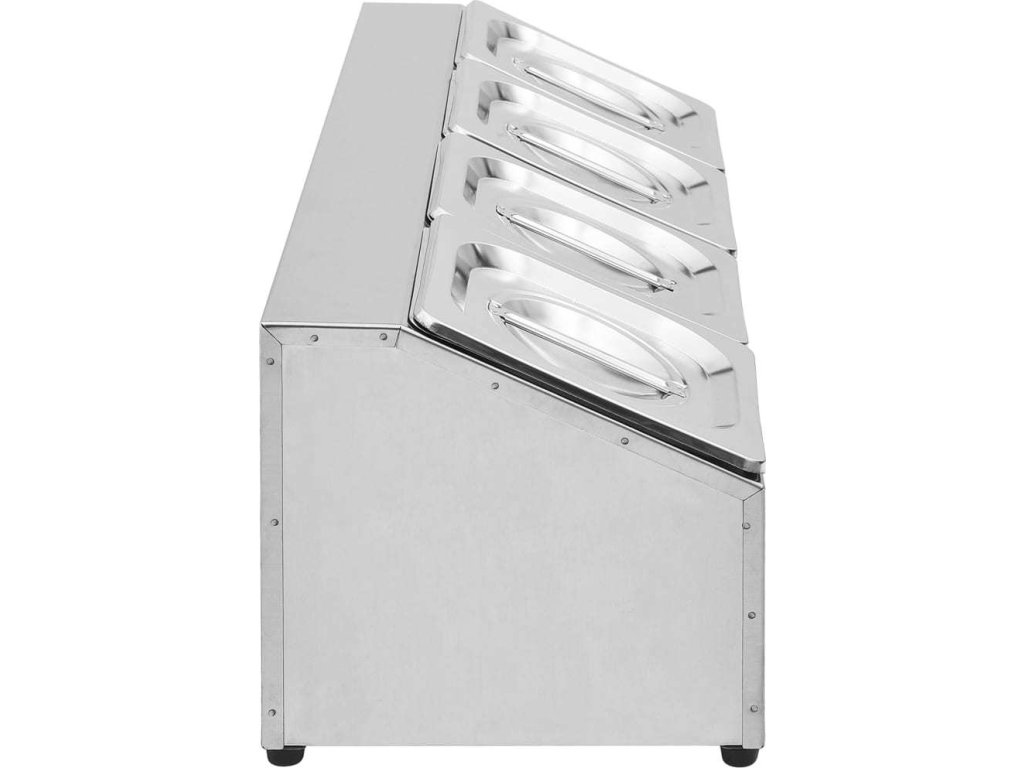 Tato nerez nástavba je vhodná do myčky a snadno se čistí. Protiskluzové gumové nožičky zaručují stabilitu nástavby a chrání pracovní povrch před poškrábáním. Salátový bar obsahuje 4 GN 1/6 nádoby, které lze vyjmout pro snadné plnění a vyprazdňování. Nástavbu dodáváme také s odpovídajícími víky, aby uložené potraviny zůstaly čerstvé, bezpečné a bez škůdců.