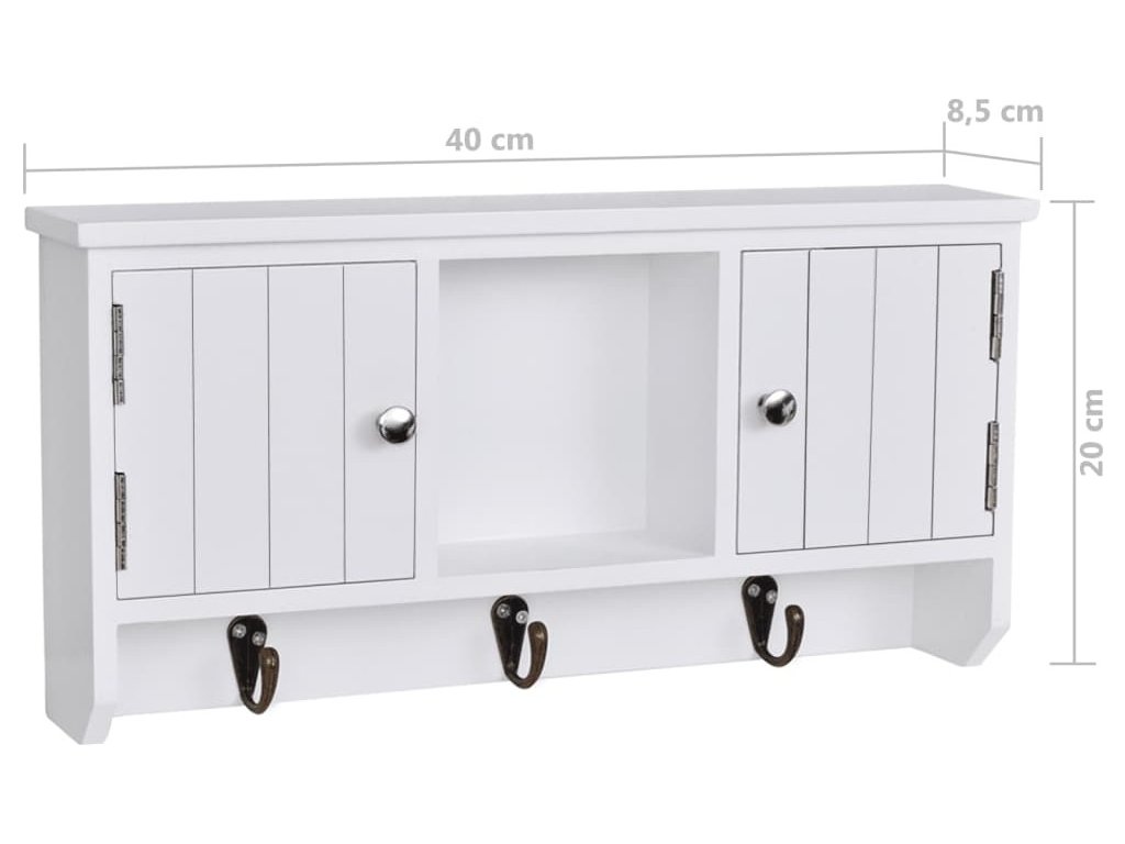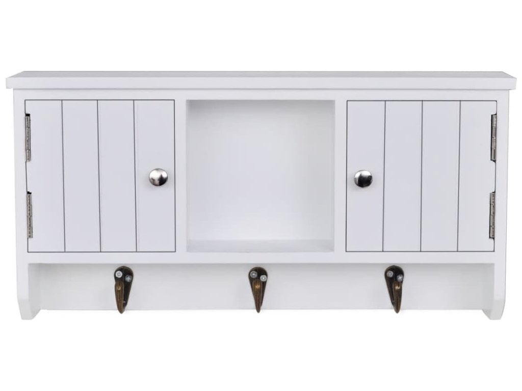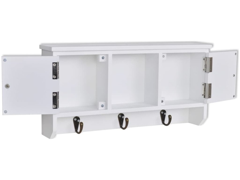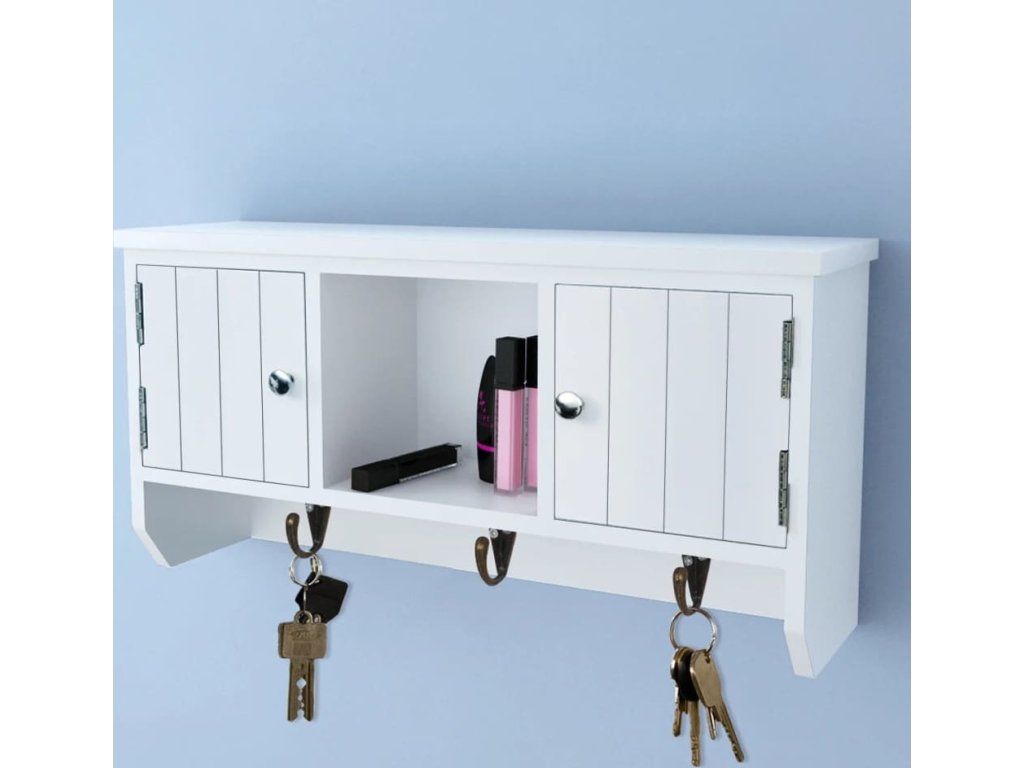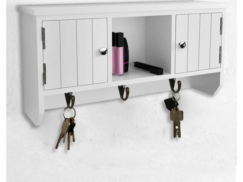 Nástěnná skříňka je opatřena třemi kovovými háčky pro zavěšení klíčů. Dvě přihrádky s dvířky a středová police poskytují dostatek prostoru pro uložení peněženek, mobilních telefonů, slunečních brýlí, šperků nebo jiných doplňků.