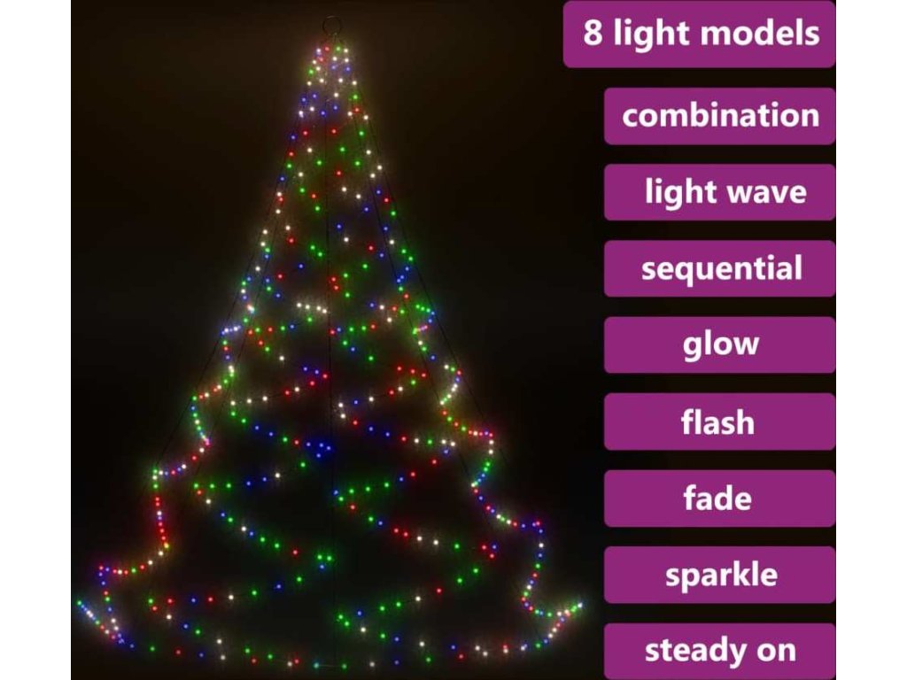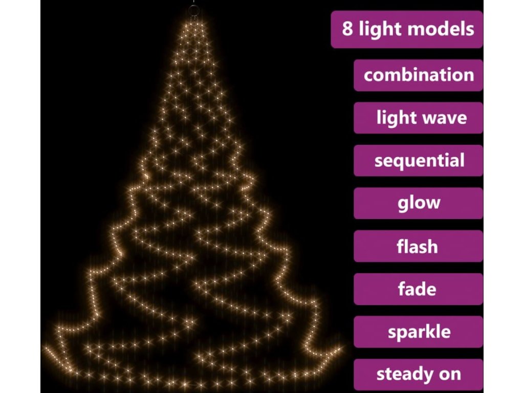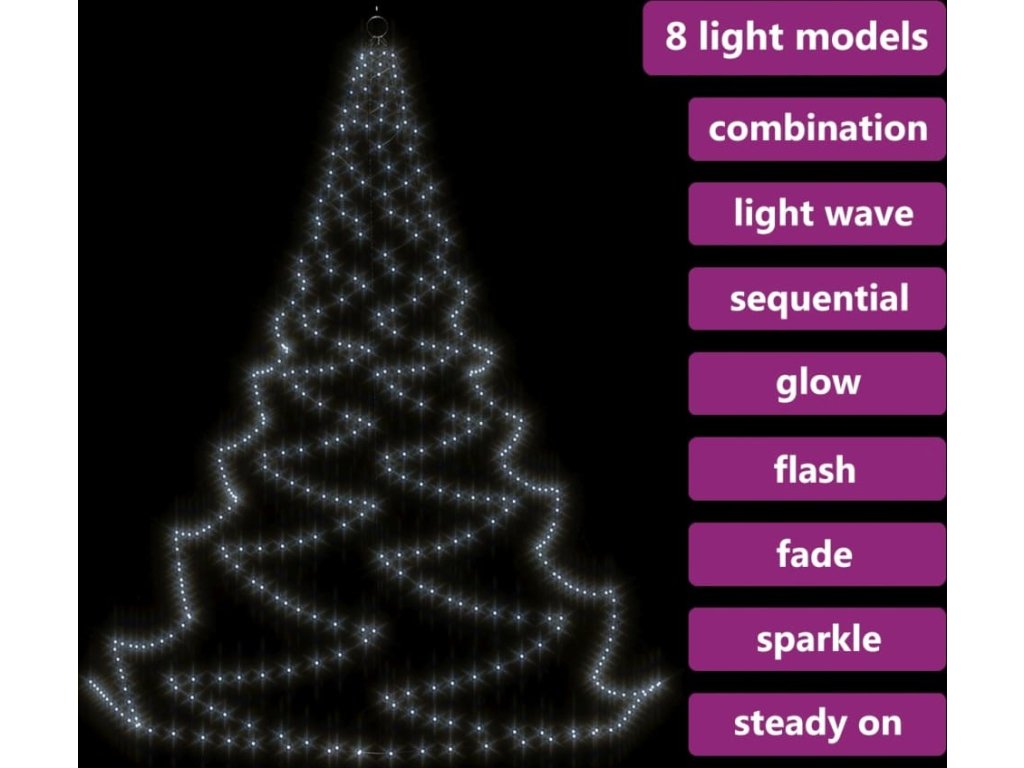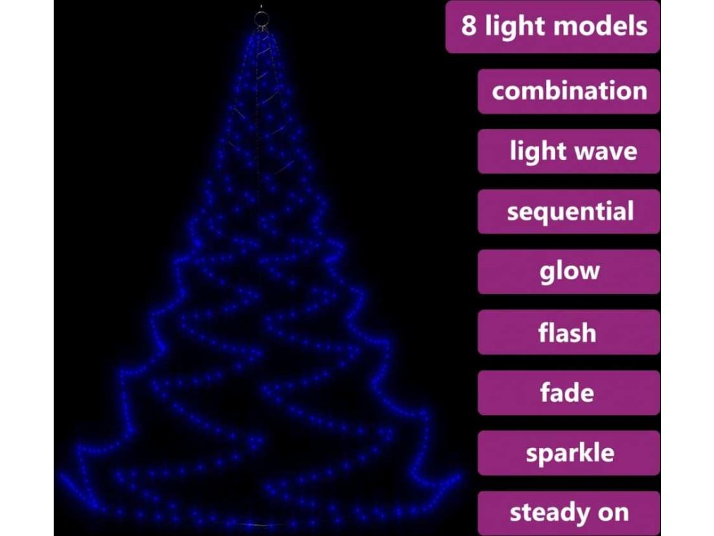 LED stromek je vybavený 720 energeticky úspornými LED diodami, které vydávají jasné světlo a jsou uspořádané ve vzájemně propojených svazcích. Diody mají 8 různých světelných režimů: kombinace všech, pomalá záře, blikání/mihotání, svícení ve vlnách, efekt tekoucí vody, sekvenční svícení, stálé svícení a pomalé blednutí. Světla se krásně rozzáří a vytvoří kouzelnou sváteční atmosféru. Tato vánoční dekorace je voděodolná, takže je vhodná pro vnitřní i venkovní použití. Dodáváme jí v kompletní sadě včetně 5 hrotů, háku a 15 stahovacích pásků k sestavení tohoto velkého LED světelného stromu.