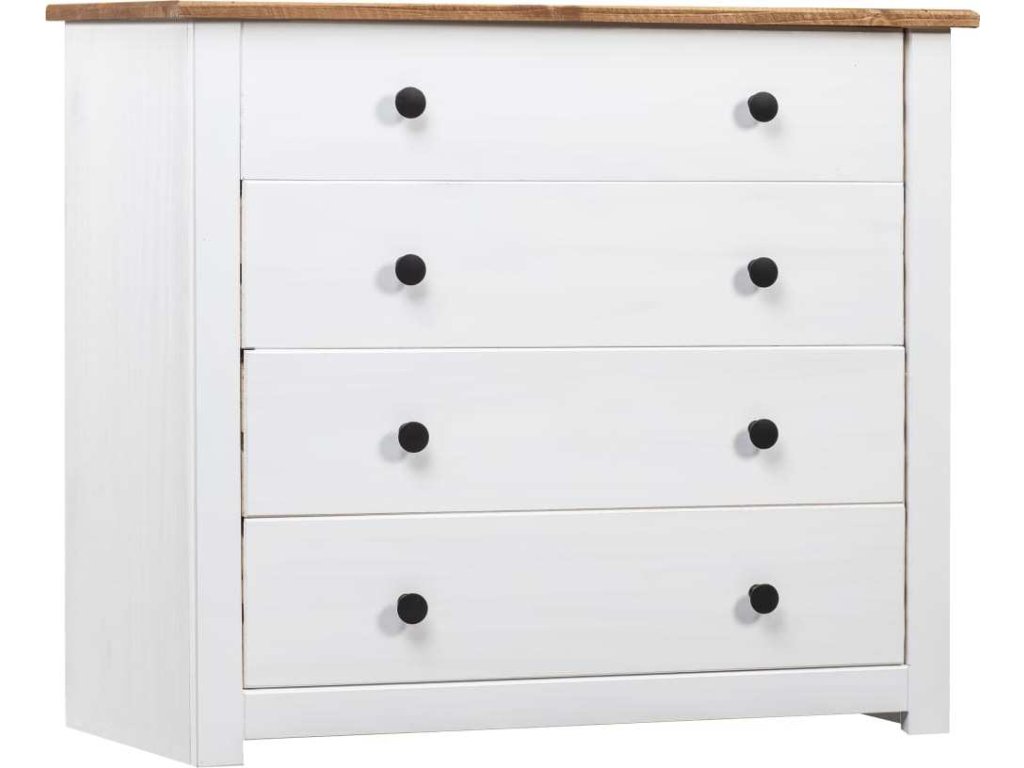 Skříňka se zásuvkami je zhotovená z masivního borového dřeva a je mimořádně odolná a stabilní. Disponuje 4 prostornými zásuvkami, které vám poskytnou spoustu úložného prostoru. Pevná horní deska navíc nabízí ideální plochu k vystavení dekorativních předmětů, zarámovaných fotografií či pokojových rostlin. K očištění skříňky vám postačí suchý hadřík. Její sestavení je snadné.