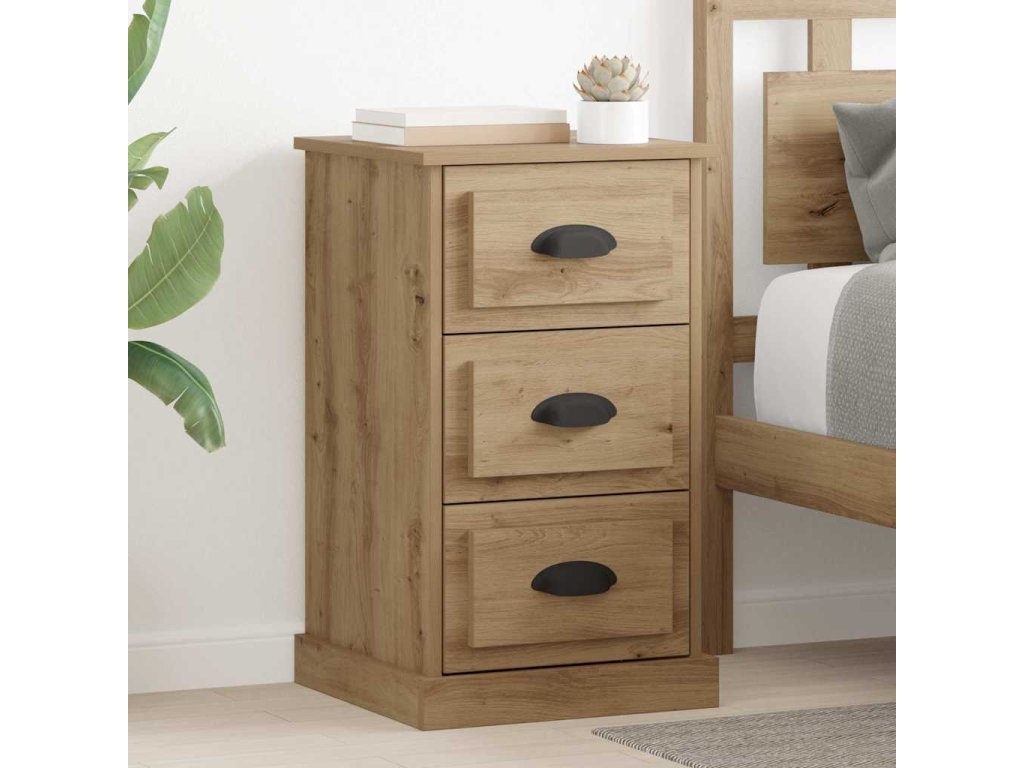 - Materiály: Tento noční stolek, vyrobený z kvalitního inženýrského dřeva, nabízí trvanlivost a krásný rustikální vzhled. Inženýrské dřevo zajišťuje, že zvládne každodenní používání a přesto si zachovává svůj klasický styl, což dodává vaší ložnici nádech elegance.