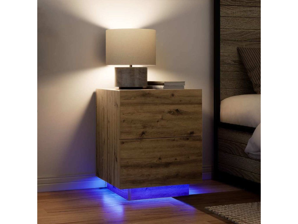 Tenhle noční stolek nabízí skvělou kombinaci funkčnosti a stylu pro vaši ložnici. Jeho rustikální design skvěle ladí s přírodním vzhledem a moderním komfortem, což z něj dělá ideální kousek pro ty, kteří chtějí eleganci a praktické využití. S kompaktními rozměry perfektně zapadne vedle vaší postele a poskytne prostor na budík, lampu nebo osobní věci. Konstrukce z inženýrského dřeva zaručuje trvanlivost a dodává vašemu pokoji teplo a charakter. Integrované LED osvětlení dále vylepšuje jeho vzhled a nabízí možnosti osvětlení pro relaxaci nebo noční čtení.
