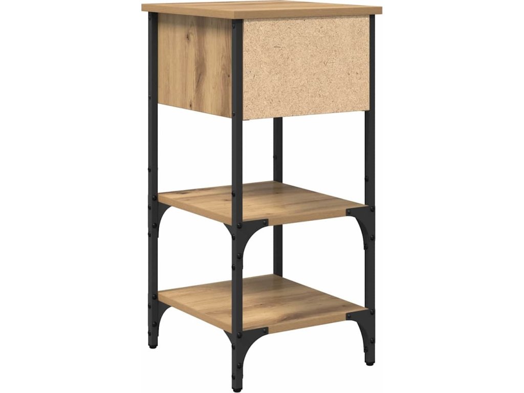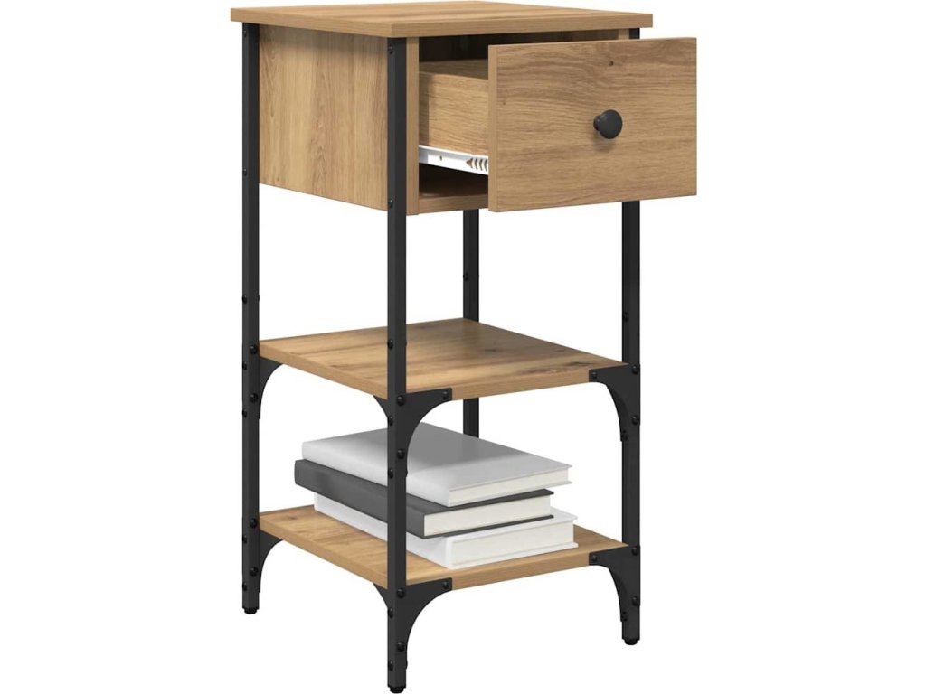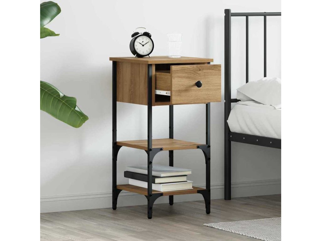 - Materiály a konstrukce: Noční stolek je z kvalitních dřevěných desek a železa, takže má robustní a odolný povrch. Tato kombinace má dlouhou životnost a je pěkná na pohled.