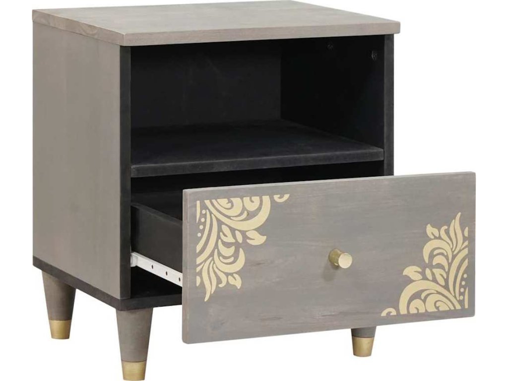 - Součásti: Obohacený o mosazné knoflíky, noční stolek má pohodlný přístup k prostornému interiéru. Tyhle knoflíky se krásně drží a každé otevření je radost. Dveře se otevírají hladce, díky pevnému mosaznému základu, který zaručuje stabilitu a elegantní vzhled.