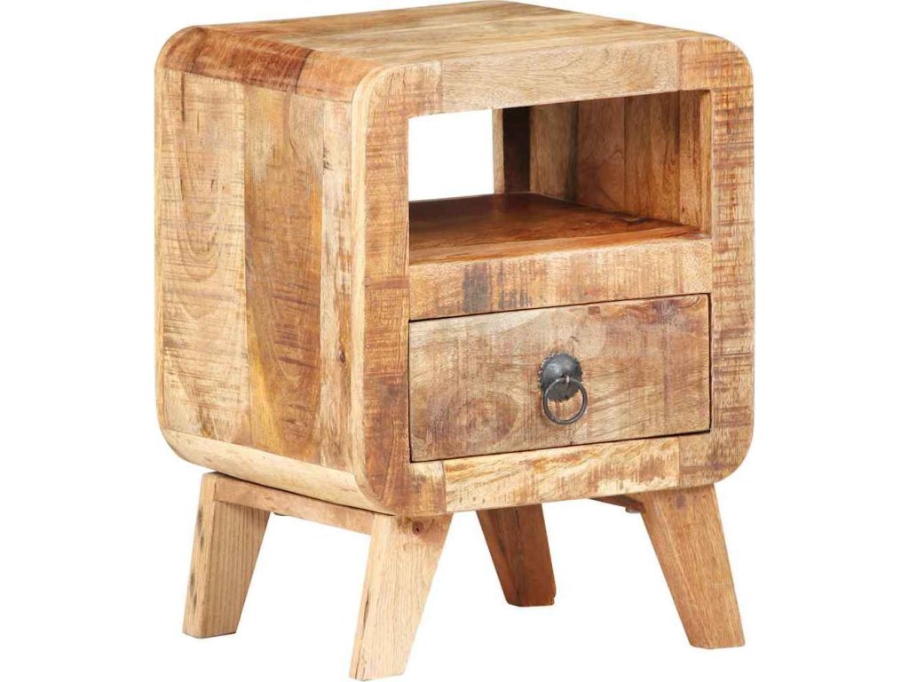 Tato noční skříňka je vyrobená z hrubého mangovníku, tvrdého dřeva, které je velmi pevné, unese značnou váhu a skvěle odolává opotřebení. Dřevo má krásnou hustou kresbu a každý kus nábytku je jedinečný a odlišuje se od všech ostatních. Bytelná horní deska je ideální pro umístění lampy, telefonu, budíku a dalších drobných předmětů nebo jen pro vystavení fotorámečků nebo jiných dekorativních předmětů. Zásuvka poskytuje dostatek místa pro přehledné uspořádání věcí na dosah ruky.