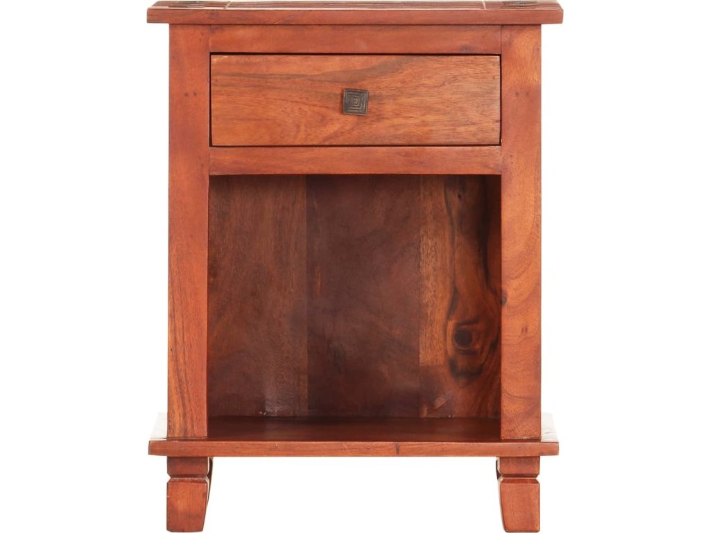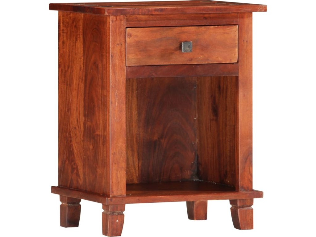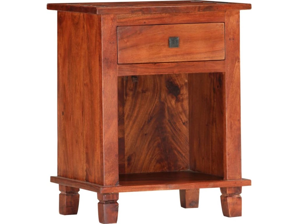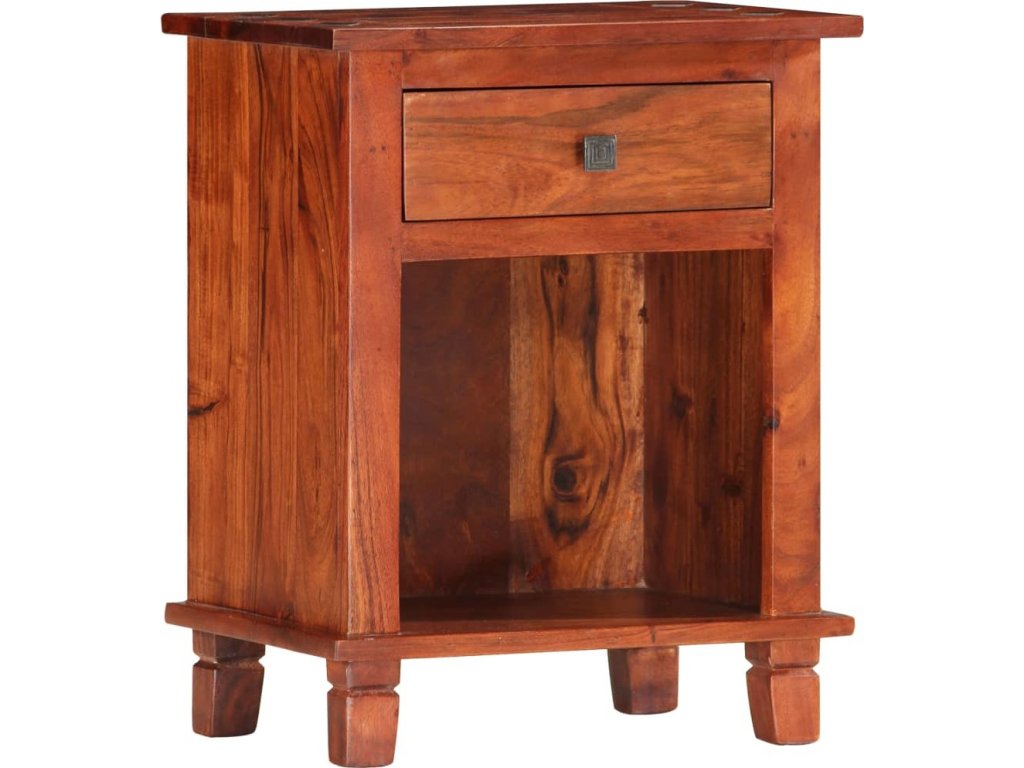 Noční stolek je vyrobený z masivního akáciové dřeva, které bylo na povrchu ošetřené tak, aby získalo rafinovaný vzhled ořechového dřeva. Na robustní horní desku si můžete postavit budík, lampičku na čtení, knihy a další věci. Místo je tu i pro vystavení fotorámečků nebo jiných dekorací. 1 zásuvka a 1 přihrádka poskytují spoustu prostoru pro přehledné uložení různých maličkostí na dosah ruky. Tato dřevěná odkládací skříňka je vyrobená s největší péčí, ať už jde o leštění, natírání nebo lakování.