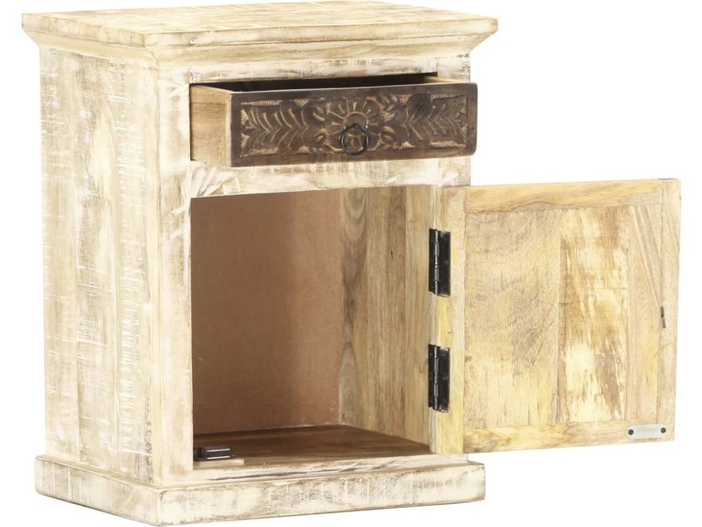 Noční stolek je vyrobený z masivního mangovníkového dřeva, což je tvrdé dřevo s hustou texturou. Hrubé mangovníkové dřevo je nejen schopné unést značnou váhu, ale výborně také odolává opotřebení a působení času. Stolek s překrásným designem je proto stabilní, odolný a příjemný na pohled. Precizní řemeslné zpracování zaručuje, že byla každému kroku výrobního procesu věnovaná mimořádná péče, ať už šlo o leštění, natírání anebo lakování. Skříňka k posteli je navržená s přihrádkou s dvířky a 1 zásuvkou s vyřezávaným vzorem, který vám navíc poskytne spoustu místa k uložení vašich zápisníčků, knížek a všelijakých dalších věcí. Produkt je již sestavený, další montáž není třeba.