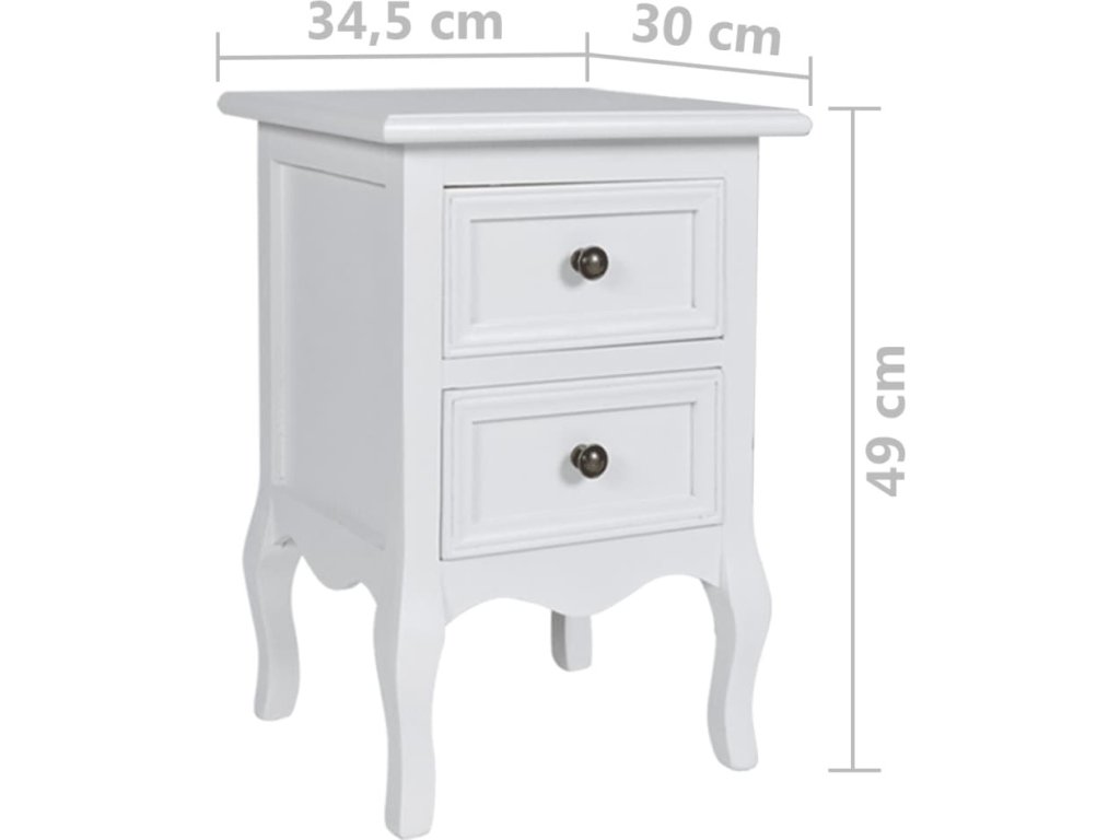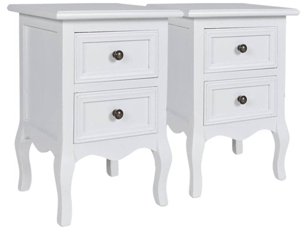 Každý noční stolek má dvě zásuvky, jejichž čelo je vyrobené z pravého jasně lakovaného dřeva. Zásuvky jsou tudíž nejen praktické, ale také spolu se zaoblenými nohami a niklovými úchytkami podtrhují elegantní styl těchto nočních stolků. Skříňky nočních stolků jsou vyrobeny z odolného bílého MDF materiálu.