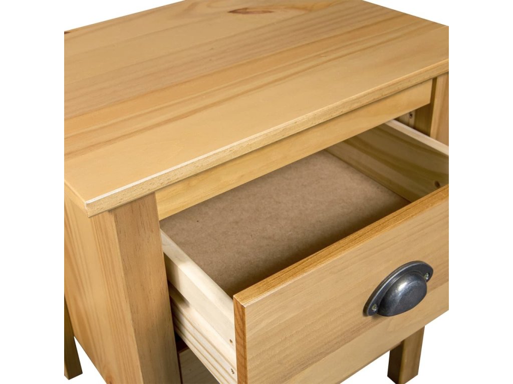 Vzhledem k univerzálnímu charakteru jej můžete také použít jako telefonní stolek nebo odkládací stolek ve vašem obývacím pokoji. Noční stolek je vyroben z masivního borového dřeva a je vysoce stabilní a odolný. Robustní horní deska je ideální pro vystavení dekorativních předmětů, jako jsou vázy a rostliny v květináčích. Dřevěný noční stolek je vybaven 1 zásuvkou a 1 policí a poskytne vám spoustu úložné prostoru pro úhledné uspořádání vašich věcí. Tato odkládací skříňka se navíc snadno čistí vlhkým hadříkem.