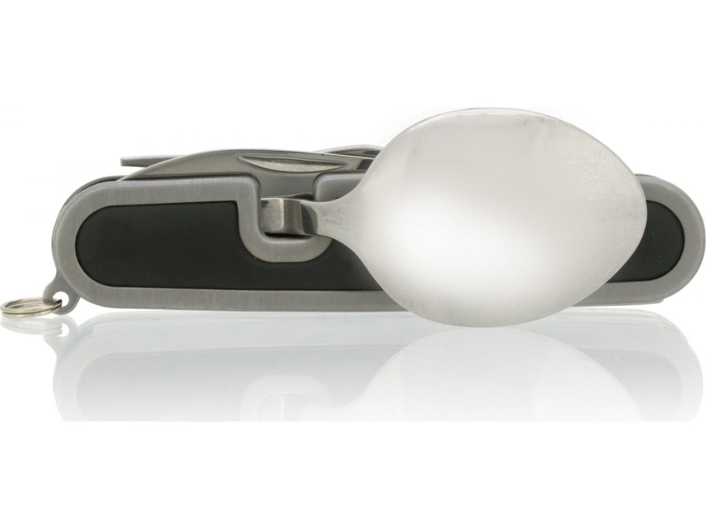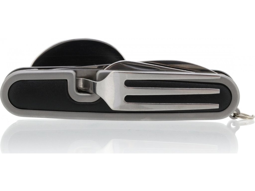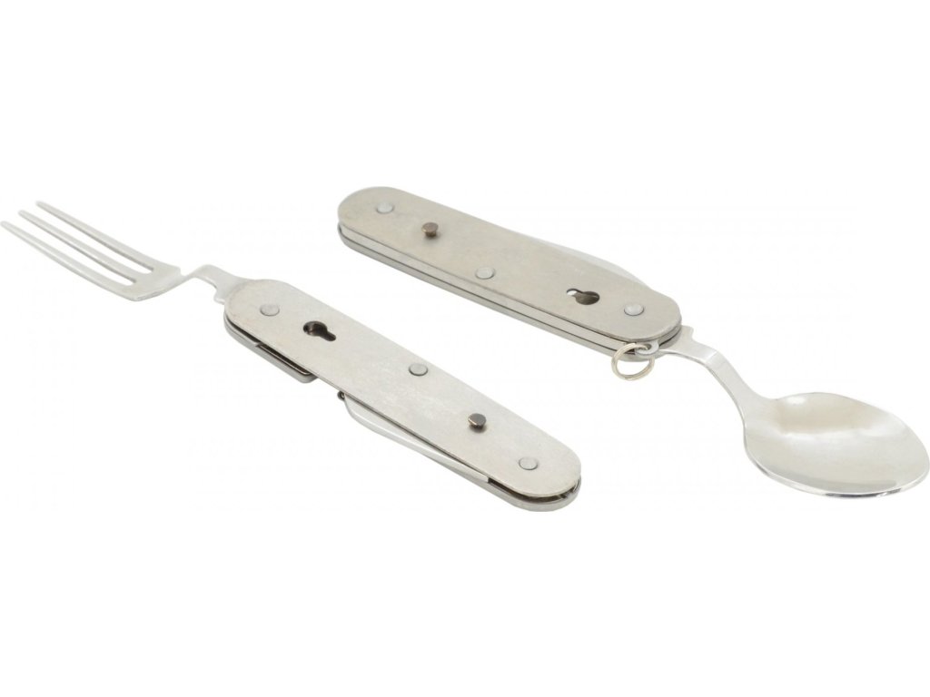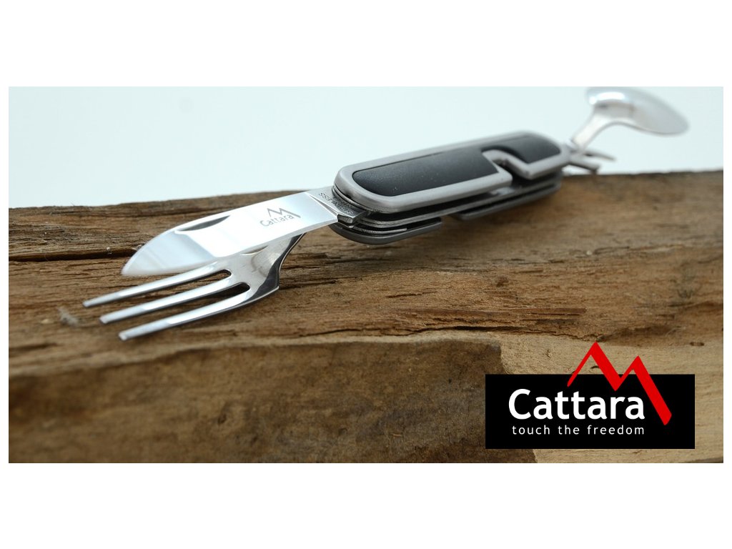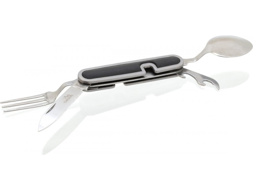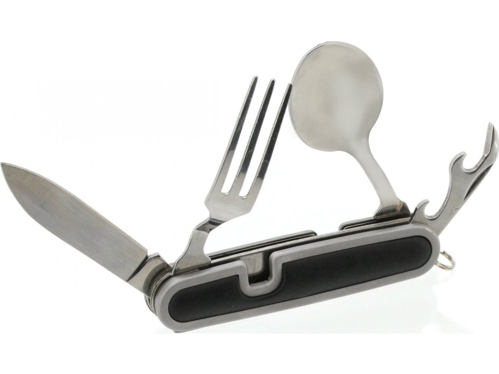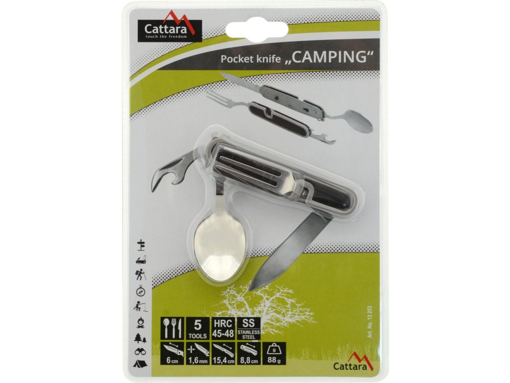 Kapesní nůž Cattara Camping využijete při stanování, na túrách, výletech do přírody i doma na zahradě. Nožík se skládá z celkem 5 nástrojů – vidlička, otvírák na plechovky a víčka lahví, lžíce a čepel nože. Rozděluje se na 2 části povytažením jedné části vpřed. Najdete na něm také kroužek pro připevnění na klíčenku. Jelikož má skládací nůž malé rozměry, vejde se vám do kapsy.