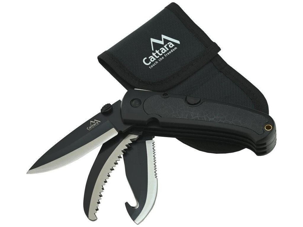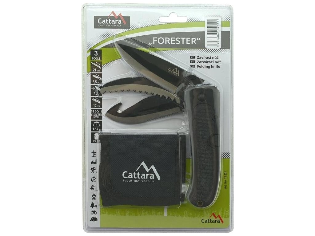 Zavírací nůž 3v1 Cattara FORESTER využijete při stanování, na túrách, při rybaření, na výletech do přírody i doma na zahradě. Najdete na něm 3 čepele – klasický nůž, pilku a univerzální nůž s ozubením a břitem, který je ideální pro přeřezávání provazů nebo plastových pásků. Na bocích těla se nacházejí dvě bezpečnostní pojistky. Velkou výhodou je navíc praktické pouzdro, které si můžete v případě potřeby zavěsit za opasek.