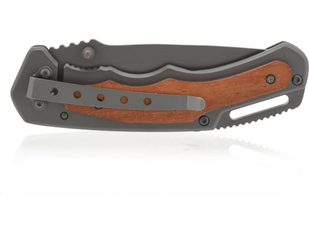 Pomocný výstupek čepele a ergonomické tvarování střenky umožní snadné a bleskurychlé otvírání nože jednou rukou. Nůž je vybaven bezpečnostní pojistkou, která se ovládá bočním posuvem palce ve spodní části rukojeti, takže nehrozí samovolné otevření. Pojistka Liner Lock brání nechtěnému zavření čepele při práci. Střenky jsou kvalitně zpracovány ze dřeva na rukojeti z nerezové oceli potažené titanem, která je na zadní straně vybavena klipsem k přichycení za okraj kapsy či opasek.