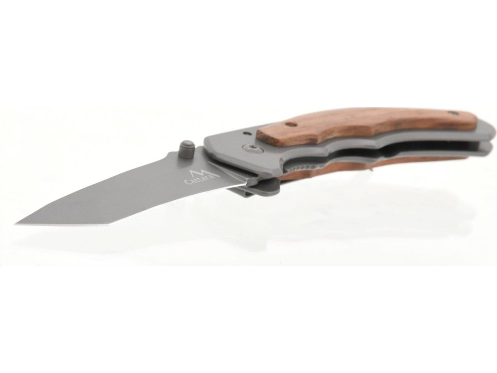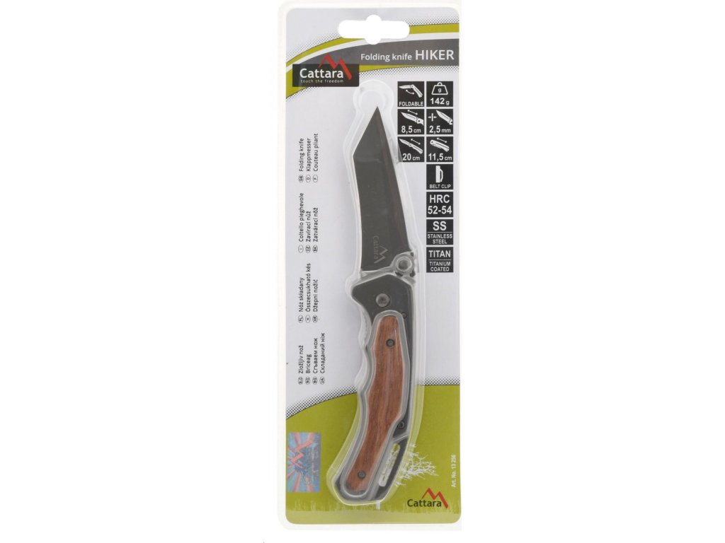 Skládací 20cm kapesní nůž Cattara Hiker je nezbytnou součástí výbavy pro camping, rybaření a většinu outdoorových aktivit. Čepel nože je zhotovena z nožířské oceli 420J2, délky 8,5 cm o síle 2,5 mm. Tato slitina chromu, niklu, manganu, křemíku, fosforu, uhlíku, síry a železa dosahuje vynikající tvrdosti HRC52-54 a je obzvláště vhodná do nepříznivého prostředí, kde exceluje svou odolností vůči korozi a vnějším vlivům.