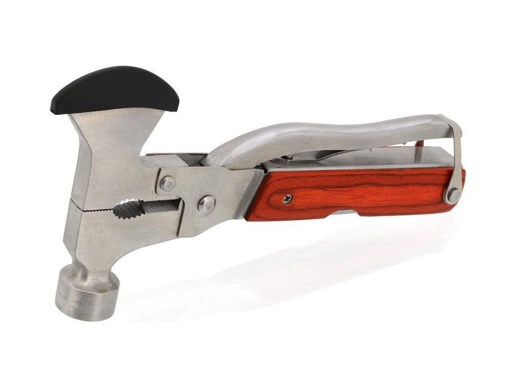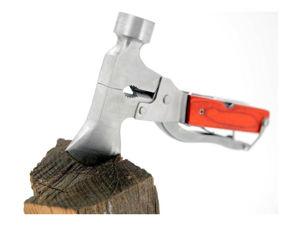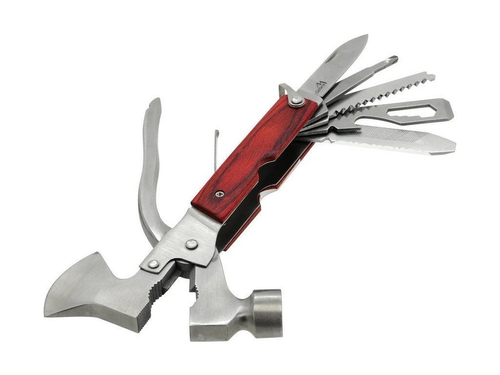 Využijte všechno nářadí a pomůcky, které nůž poskytuje. Najdete v něm kladivo, sekyrku, kombinované kleště, nůž délky 7 cm, křížový šroubovák s běžnými rozměry, pilku na dřevo, odstraňovač šupin, pilník se zakončením, plochý šroubovák, otvírák a kombinovaný imbusový nástavec.